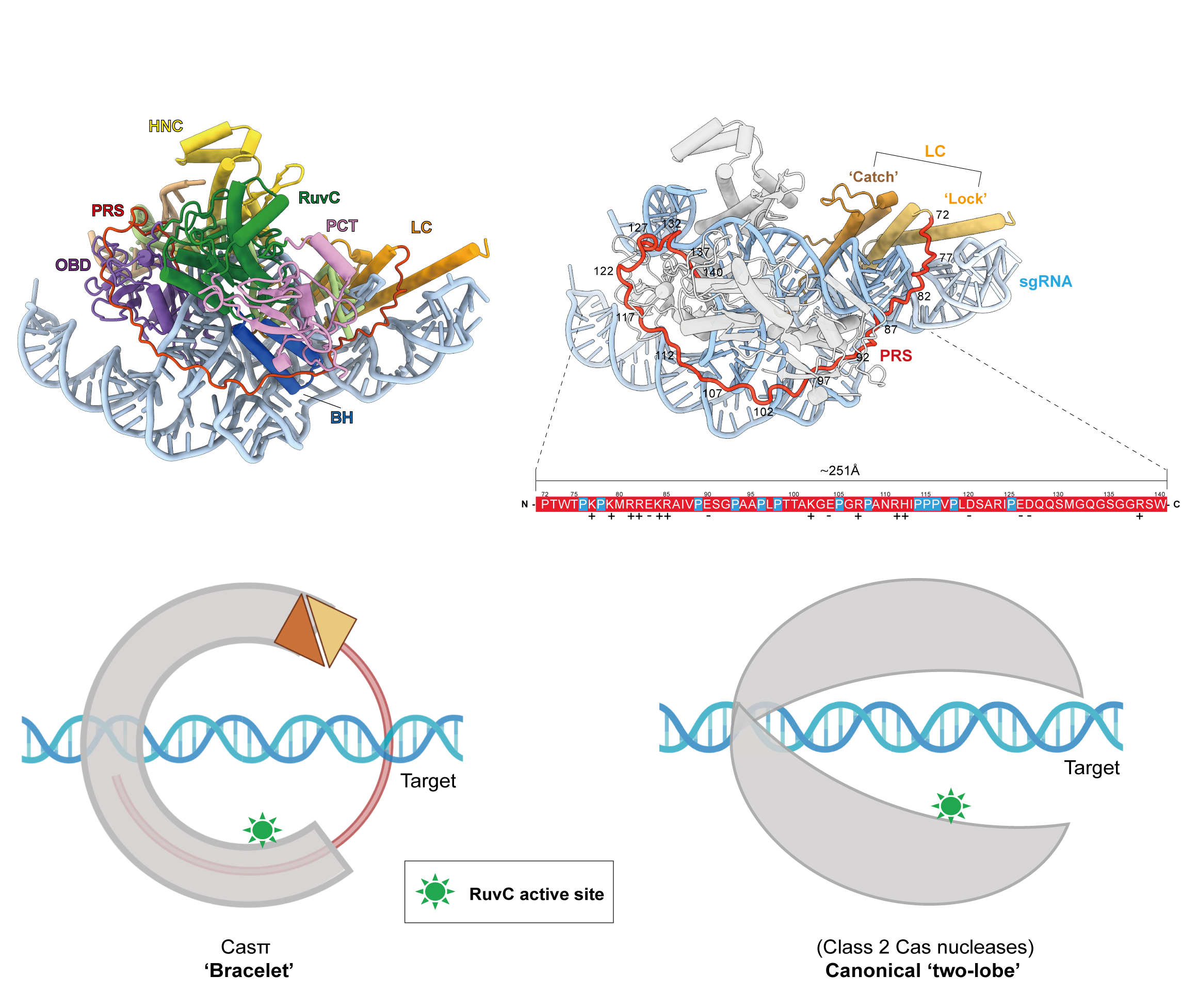图3. Casπ-gRNA-DNA复合体结构;PRS结构域及“手环(bracelet)”状结构模式图
