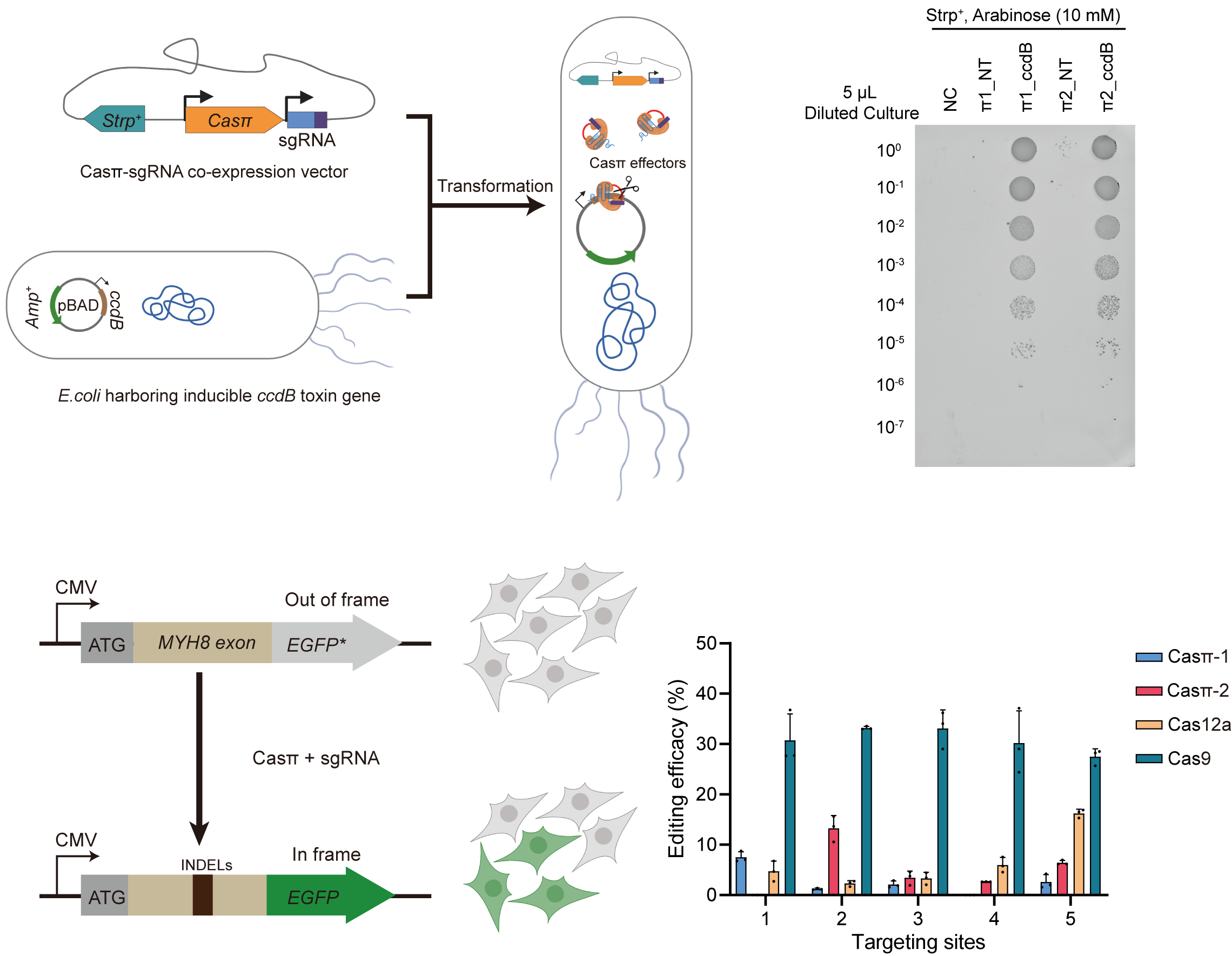图 2. Casπ在细菌体内质粒切割及哺乳动物细胞体内的基因编辑效率结果展示