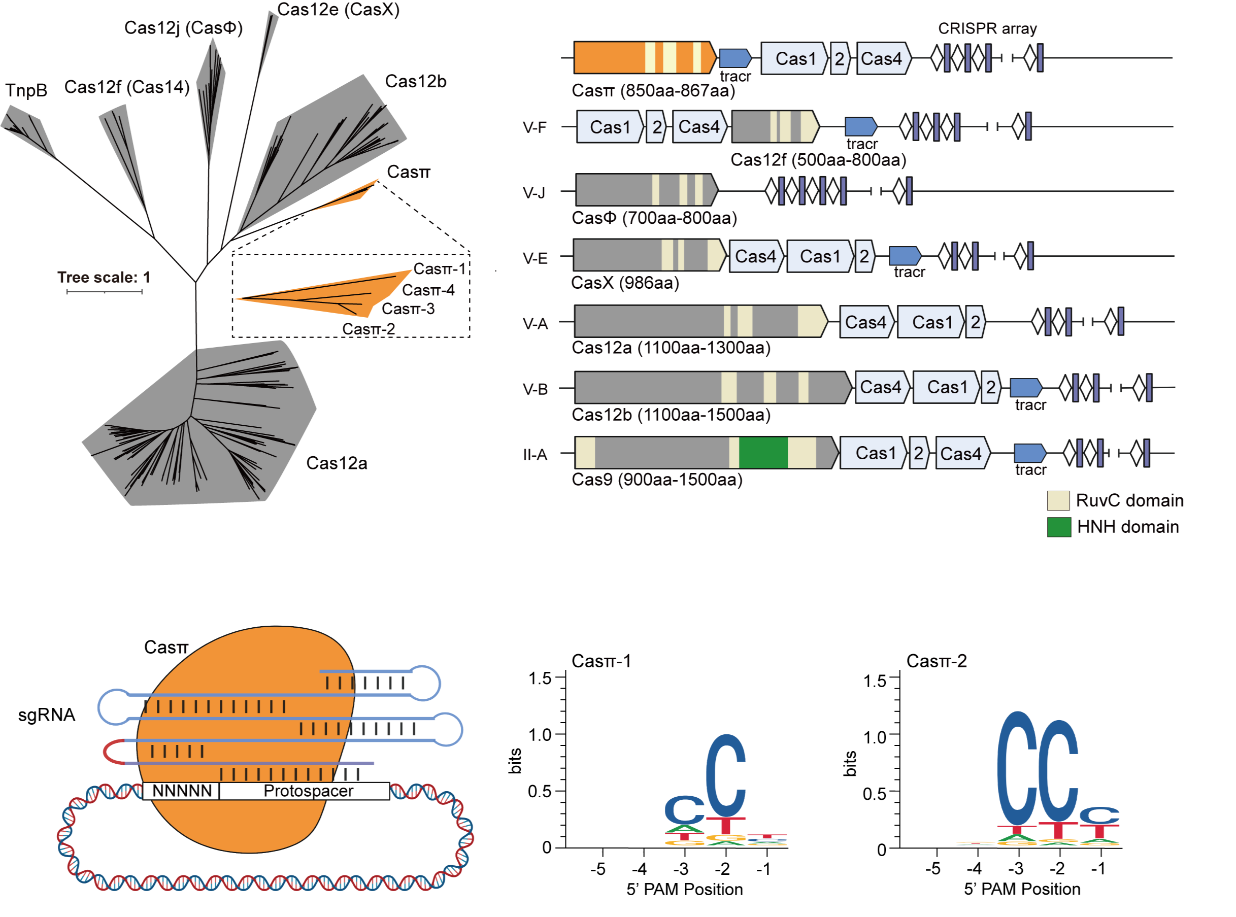 为了寻找区别于已知家族的全新CRISPR-Cas系统,课题组首先构建了一套优化的生物信息挖掘流程,对Cas蛋白的RuvC结构域序列构建隐马尔可夫模型(HMM),利用多轮迭代,在维持Cas核心特点的同时,增加差异度。利用该迭代模型结合多种CRISPR-Cas预测方法,课题组在北京和天津的城市污水宏基因组数据中,发现一类新型非致病菌来源的小型CRISPR-Casπ(Cas12l)系统,Casπ蛋白仅由850-867个氨基酸组成,属于II类-V型 CRISPR-Cas系统(图1)。