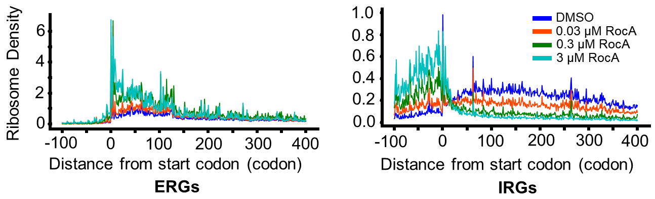 使用这一策略,杨雪瑞课题组首次揭示化合物RocA通过翻译起始因子eIF4A调控翻译延伸过程的新功能。这一成果于2023年2月2日发表于Nature Communications,文章题目:核糖体分析大数据集的重新分析揭示RocA通过eIF4A蛋白对翻译延伸动态的干扰作用(Reanalysis of ribosome profiling datasets reveals a function of rocaglamide A in perturbing the dynamics of translation elongation via eIF4A)。