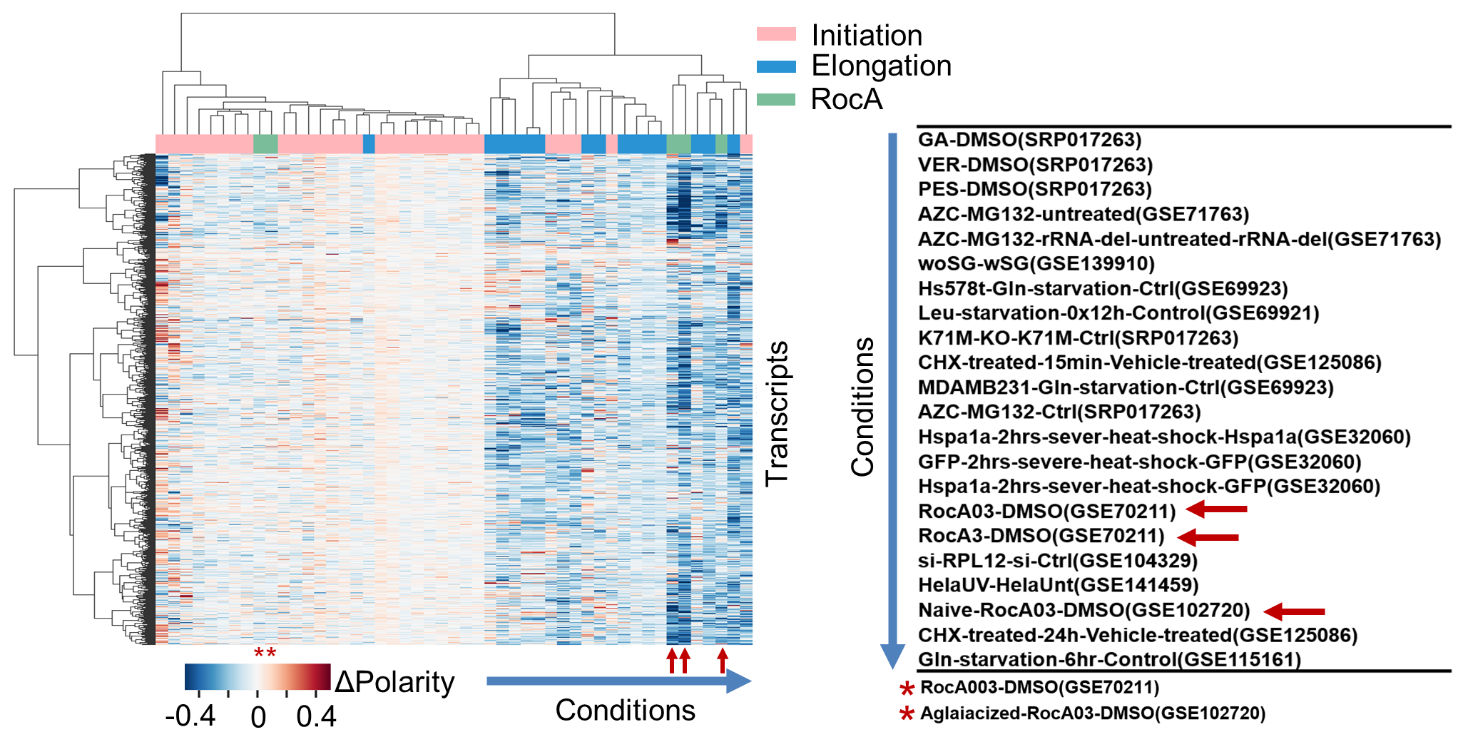 RocA是楝科植物中发现的天然化合物,具有非常好的抗肿瘤、抗病毒功能。RocA及其衍生物是近年来临床研究的热门分子。此前的研究证明RocA通过其靶点蛋白eIF4A,阻碍43S翻译前起始复合物PIC在5’ UTR上的扫描,从而抑制翻译起始。在杨雪瑞课题组的研究中,他们首先收集整理了100余套人类细胞在不同药物或基因扰动条件下的核糖体分析数据,并使用此前开发的翻译组数据解析工具,定量分析了细胞翻译起始与延伸动态过程的变化,形成覆盖各种翻译调控模式的参考坐标系。其中一个非常令人意外的观察是,作为众所周知的翻译起始抑制剂,RocA却与其它经典的翻译延伸调控作用聚为一类。