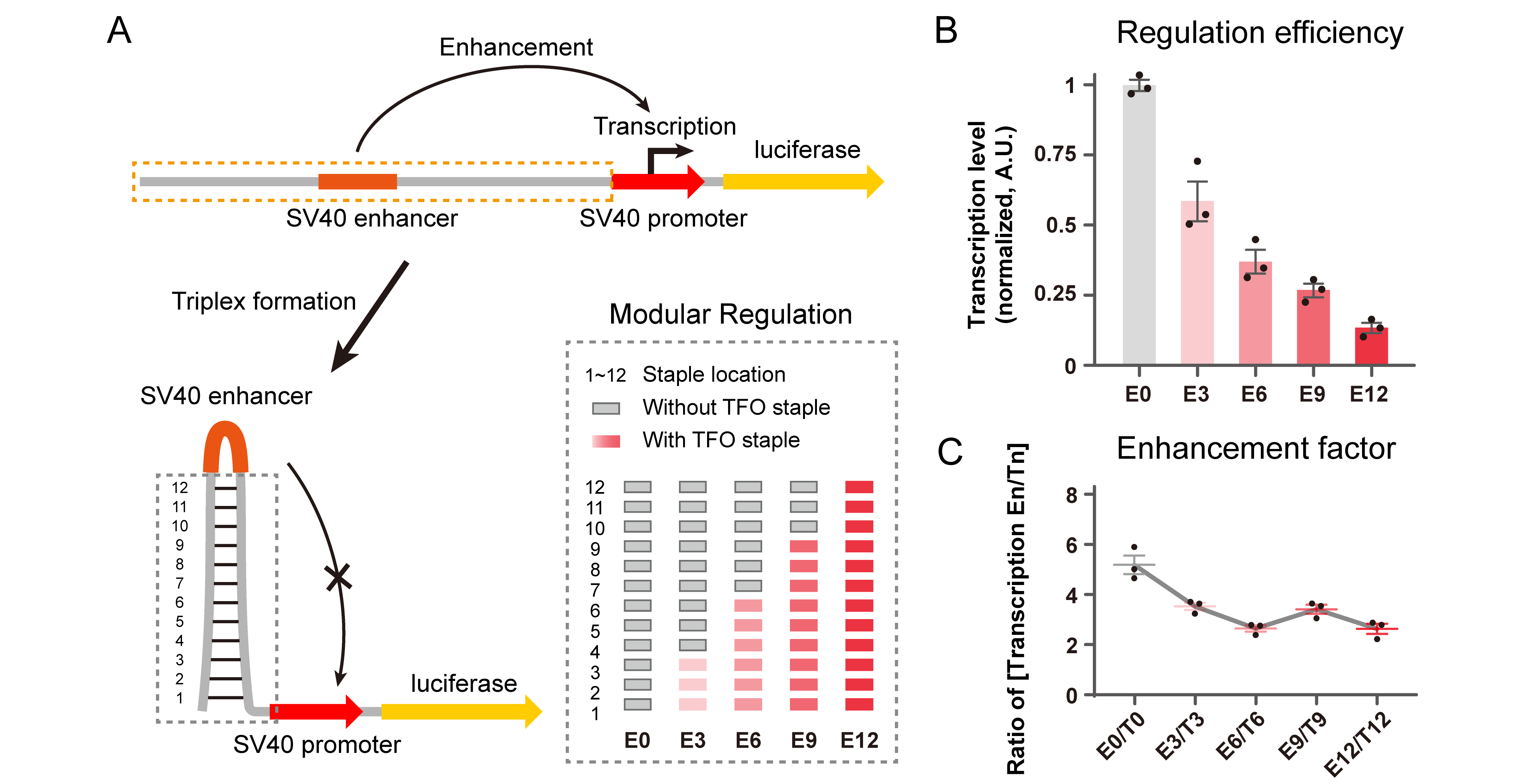 凭借着此策略对双链DNA构象的可控性调节,我们接下来又初步探索了双链DNA构象调节在转录活动中可能发挥的作用。我们将目的基因前端序进行折叠形成特定的构象,使其抑制转录元件与启动子之间的识别和结合从而抑制相关基因的转录水平。并通过模块化的组装设计,确定了构象折叠程度与转录水平的关联。本研究建立了新的组装策略,拓展了核酸纳米结构的设计空间,丰富了DNA纳米结构的应用前景,对今后DNA纳米结构领域的发展具有重要的意义。