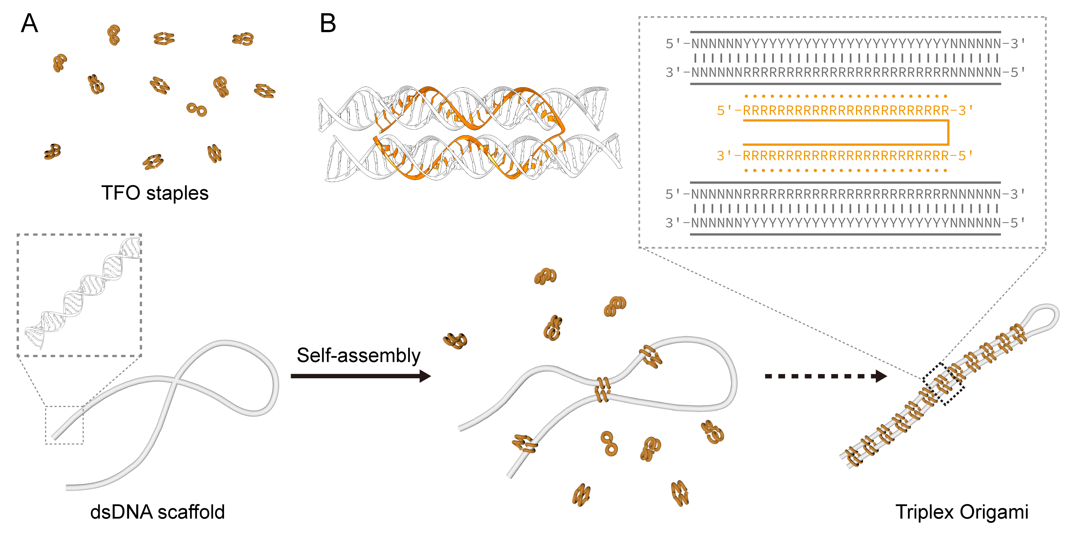 (A)组装过程示意图。(B)三螺旋结构形成位点以及TFO链结构示意图