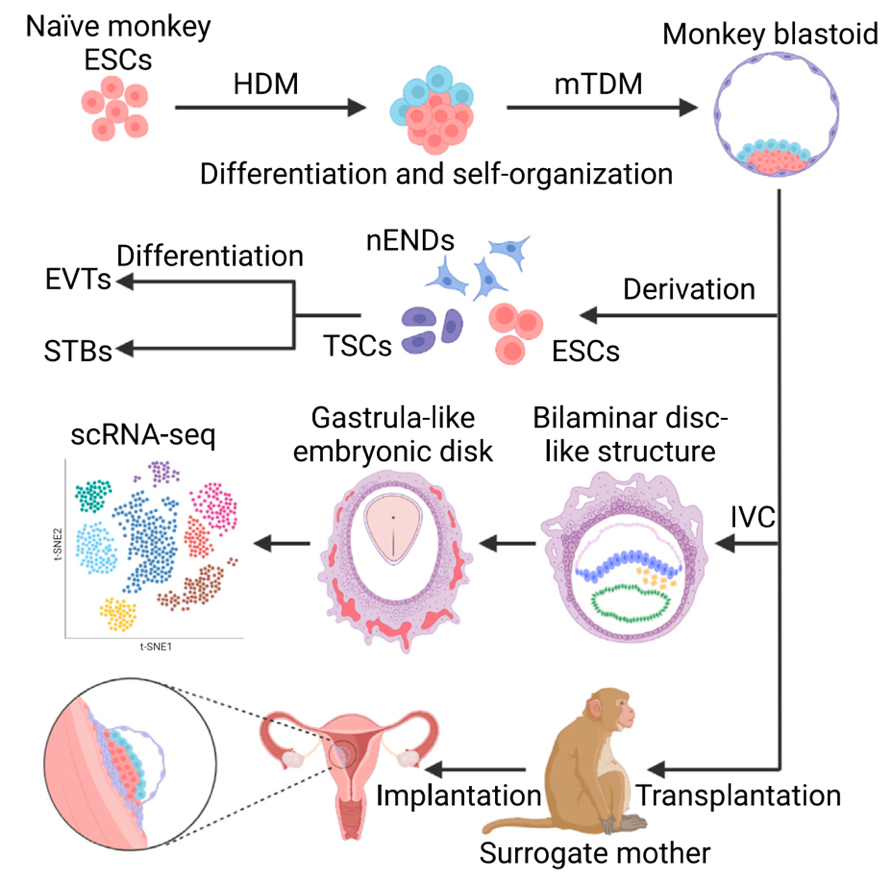 图2. 非人灵长类类囊胚体外重构和体内外发育潜能研究模式图