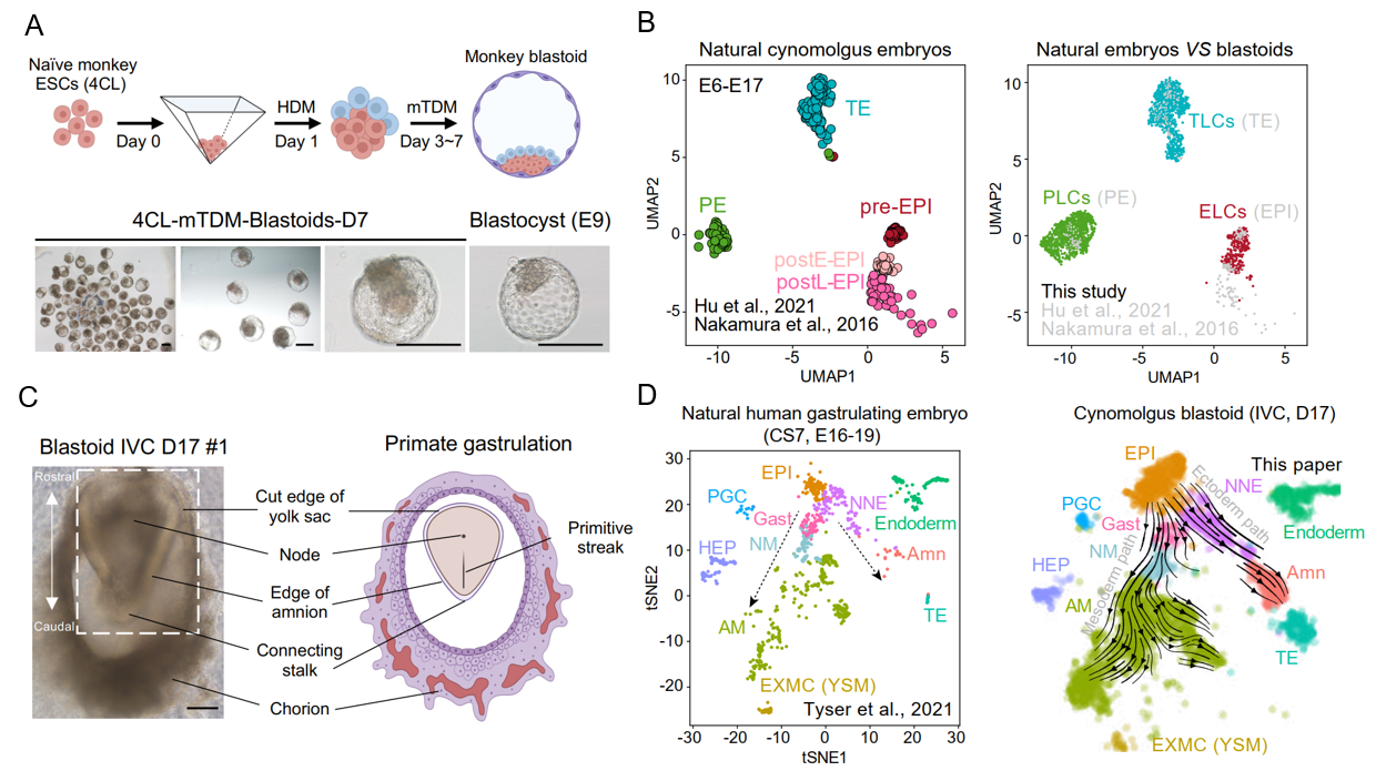 首先,研究人员利用食蟹猴胚胎干细胞进行类囊胚的体外构建。通过比较不同培养状态的食蟹猴胚胎干细胞并进一步优化体外诱导体系和方法,最终确认了4CL原始态(Naïve)胚胎干细胞体系与HDM-mTDM两步法诱导,能够高效获得和食蟹猴生理囊胚形态上接近的类囊胚(图1A)。进一步的单细胞转录组测序分析、体外分离与干细胞建系等实验,提示新构建的食蟹猴类囊胚具有与生理囊胚相似的细胞谱系以及转录组特征(图1B)。
