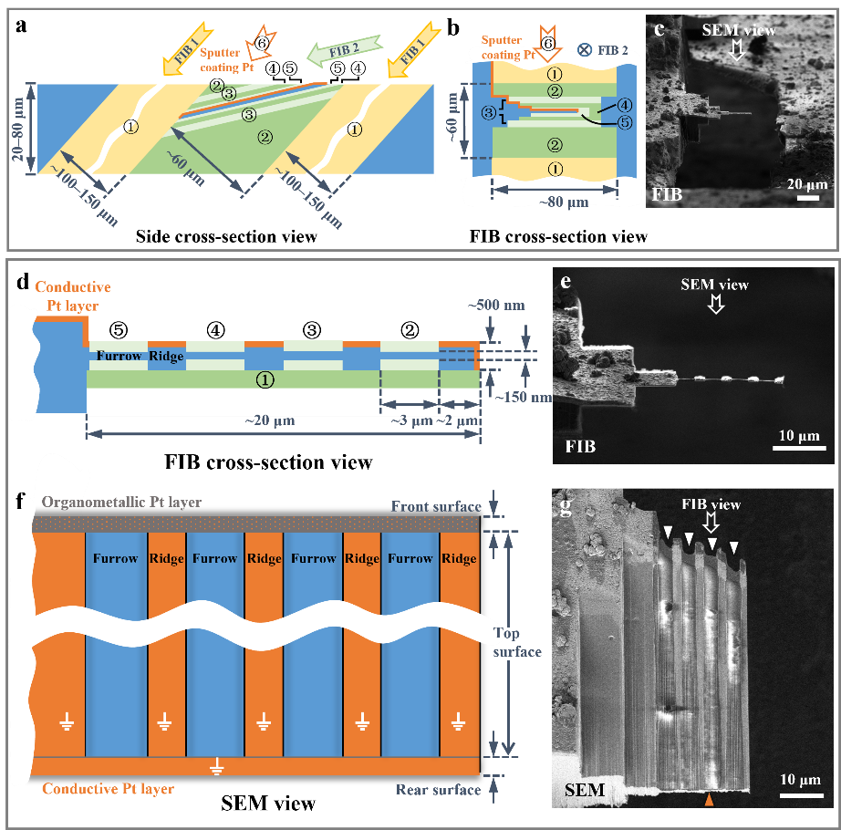 a-c 聚焦离子束粗切过程。d-g 聚焦离子束精修过程。