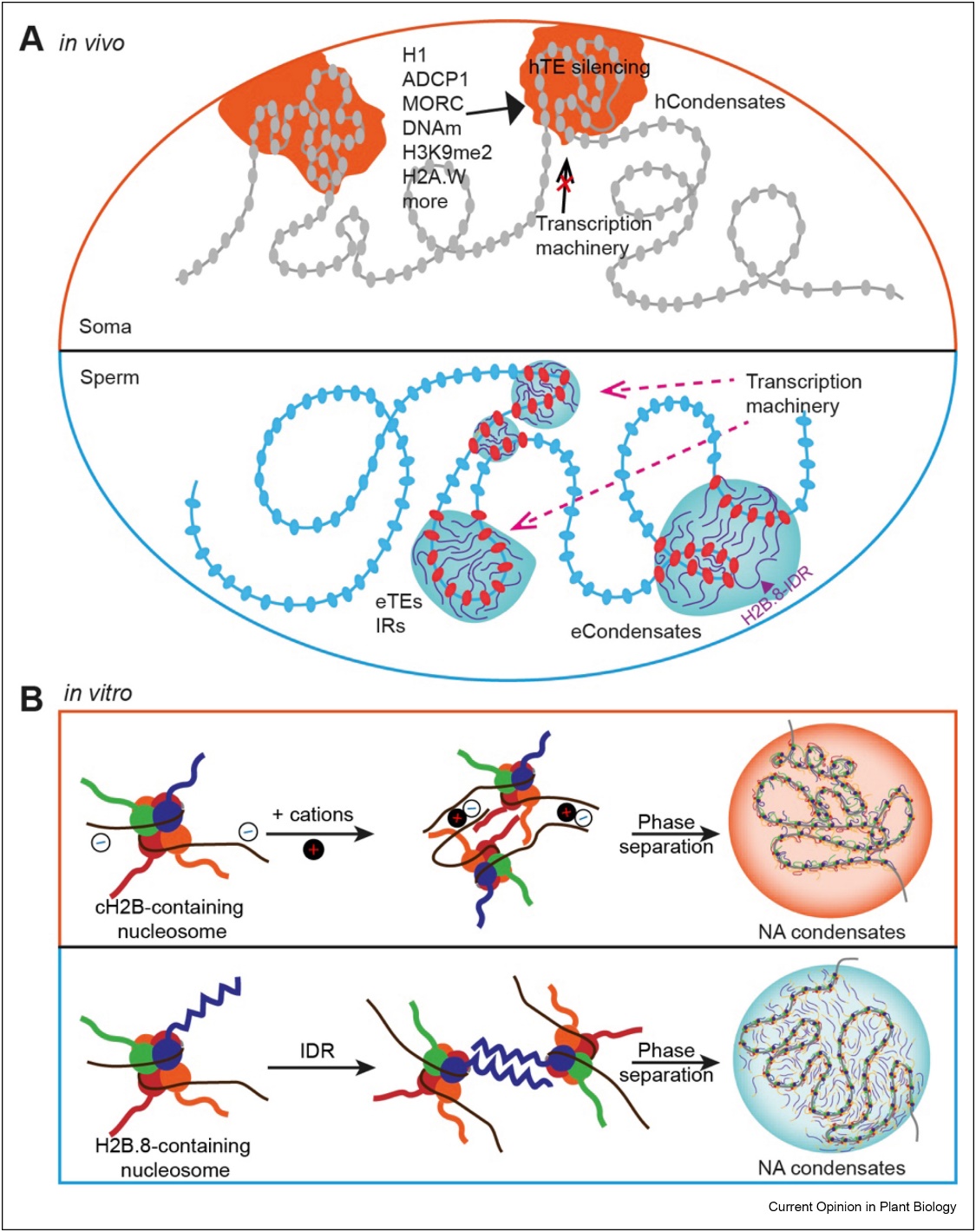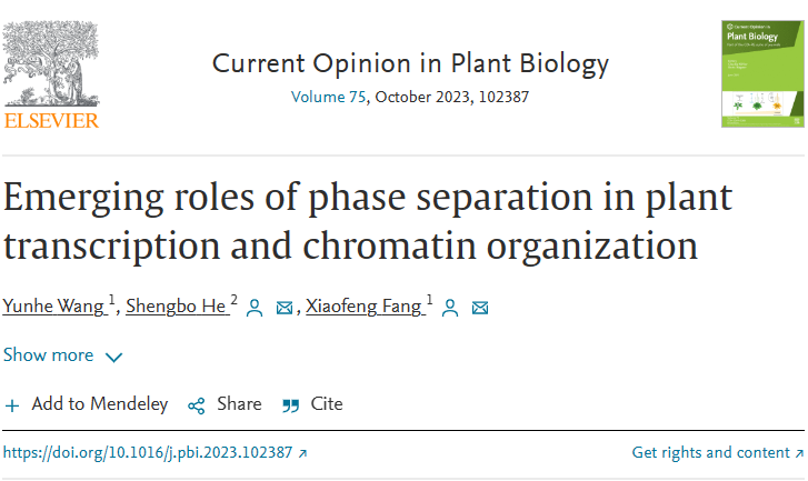 2023年6月13日,清华大学方晓峰课题组与合作者应邀在Current Opinion in Plant Biology共同撰写了题为“Emerging roles of phase separation in plant transcription and chromatin organization”的综述论文,讨论了植物中相分离在RNA介导的染色质沉默、转录活性调节以及染色质区室化中发挥重要作用的最新进展,并进一步展望了相分离在植物转录调控和染色质重构中的研究潜力和挑战。
