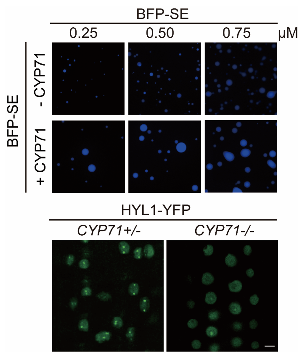 研究发现,CYP71可以与SE发生直接相互作用,研究组因此检测了CYP71是否调控SE相分离及切割小体形成。结果表明,在体外,CYP71促进SE相分离及切割小体的组装,在植物体内,CYP71的突变会导致大多数植物细胞不能形成切割小体(图2)。CYP71具有PPIase活性结构域。通过对两个保守的氨基酸残基(R519或F524)进行定点突变,构建了PPIase活性减弱的CYP71变体。发现CYP71变体不能促进SE相分离及切割小体的组装,说明CYP71利用其PPIase活性促进SE相分离及切割小体形成。