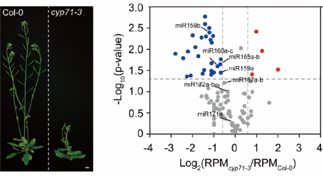 在该研究中,戚益军研究组首先通过正向遗传筛选发现,CYP71调控miRNA的产生和植物发育(图1)。CYP71的突变导致很多miRNA的积累水平显著降低,而其靶基因表达升高。在cyp71突变体中,MIR基因的转录水平基本没有变化,但miRNA前体水平升高,提示CYP71可能正向调节miRNA加工。