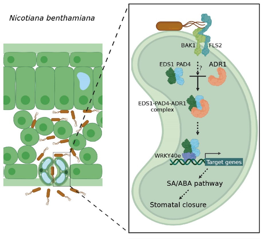 2023年10月18日,清华大学生命科学学院、植物生物学研究中心齐天从研究组在《植物细胞》(The Plant Cell)在线发表题为“NLR免疫受体ADR1与脂肪酶类蛋白EDS1-PAD4调控植物气孔免疫” (The NLR immune receptor ADR1 and lipase-like proteins EDS1 and PAD4 mediate stomatal immunity in Nicotiana benthamiana and Arabidopsis) 的研究论文。该工作首次揭示植物NLR免疫受体ADR1及其互作核心组分EDS1-PAD4共同介导保卫细胞特异的气孔免疫反应,发现ADR1-EDS1-PAD4模块与关键转录因子WRKY40e协作调控气孔免疫,阐明细胞内NLR类型免疫受体通过转录因子调控激素途径控制气孔免疫的信号传导通路。