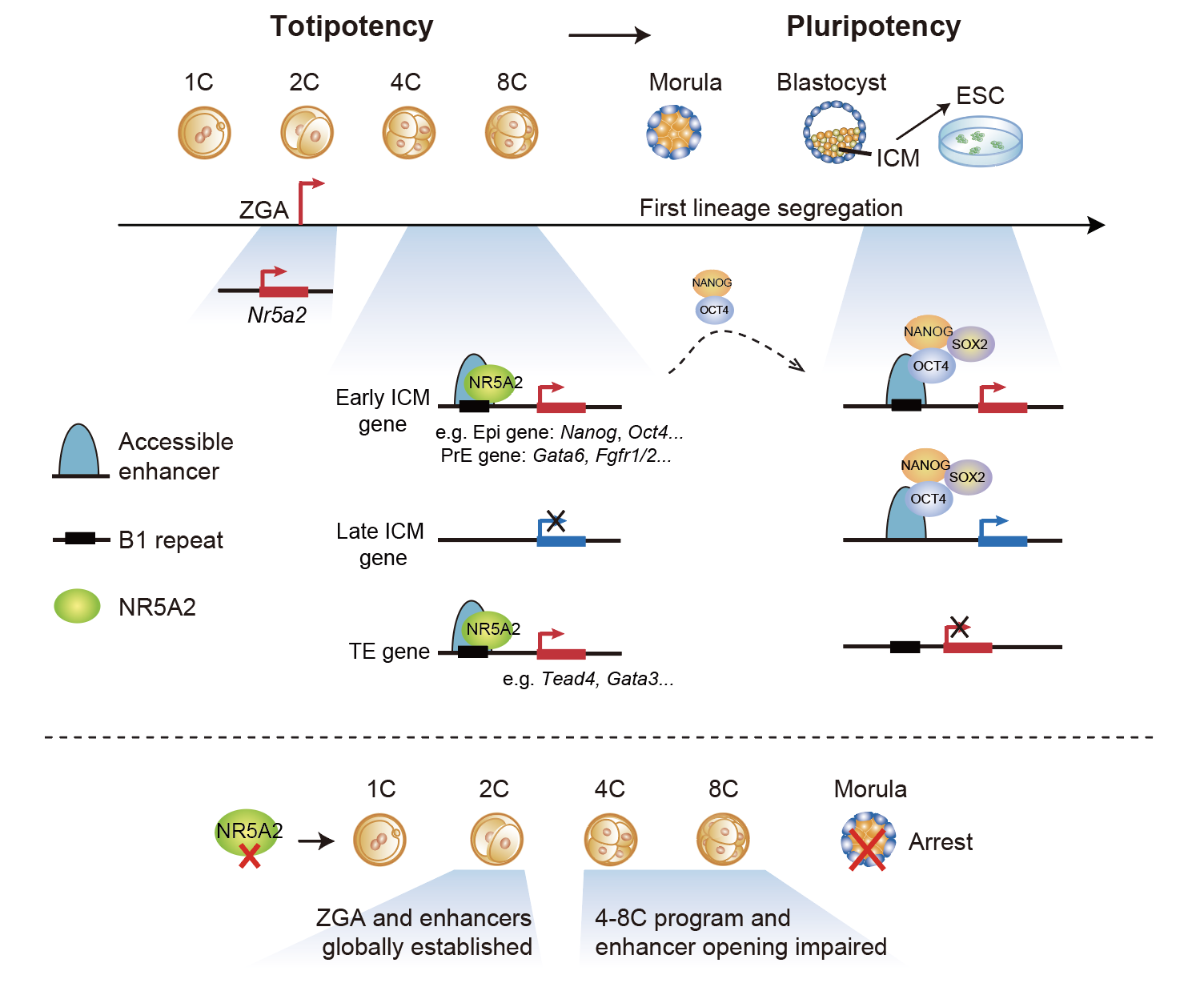 哺乳动物生命起始于终末分化的精子和卵子通过受精过程形成一个全能性的受精卵。受精卵最初处于全基因组转录沉默状态。不同哺乳动物经过一或几轮细胞分裂后,受精卵开始发生第一次转录事件称为合子基因组激活(Zygotic genome activation,ZGA)。ZGA发生后,随着胚胎发育的进行,出现第一次谱系分化从而形成内细胞团(ICM)和外胚层(TE)。ICM随后发育形成具有Nanog表达的外胚层(Epi)和Gata6表达的原始内胚层(PrE)。在体外,ICM可以诱导获得胚胎干细胞,胚胎干细胞以及诱导多能干细胞的转录调控网络可以一定程度上反映多能性建立和维持的过程。例如核心多能性转录因子NANOG、SOX2和OCT4共同调控多能性的转录网络。然而迄今为止,在体内,ZGA如何与哺乳动物胚胎的第一次谱系分化相连接以及胚胎的多能性如何建立仍然不清楚。