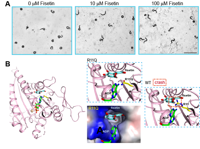图1:A) 非瑟酮(Fisetin)显著改善KIF1A(R11Q)突变线虫形态方面缺陷; B)非瑟酮(Fisetin)模拟对接在KIF1A马达结构域(R11Q)突变体ATP结合口袋中的结构模型。