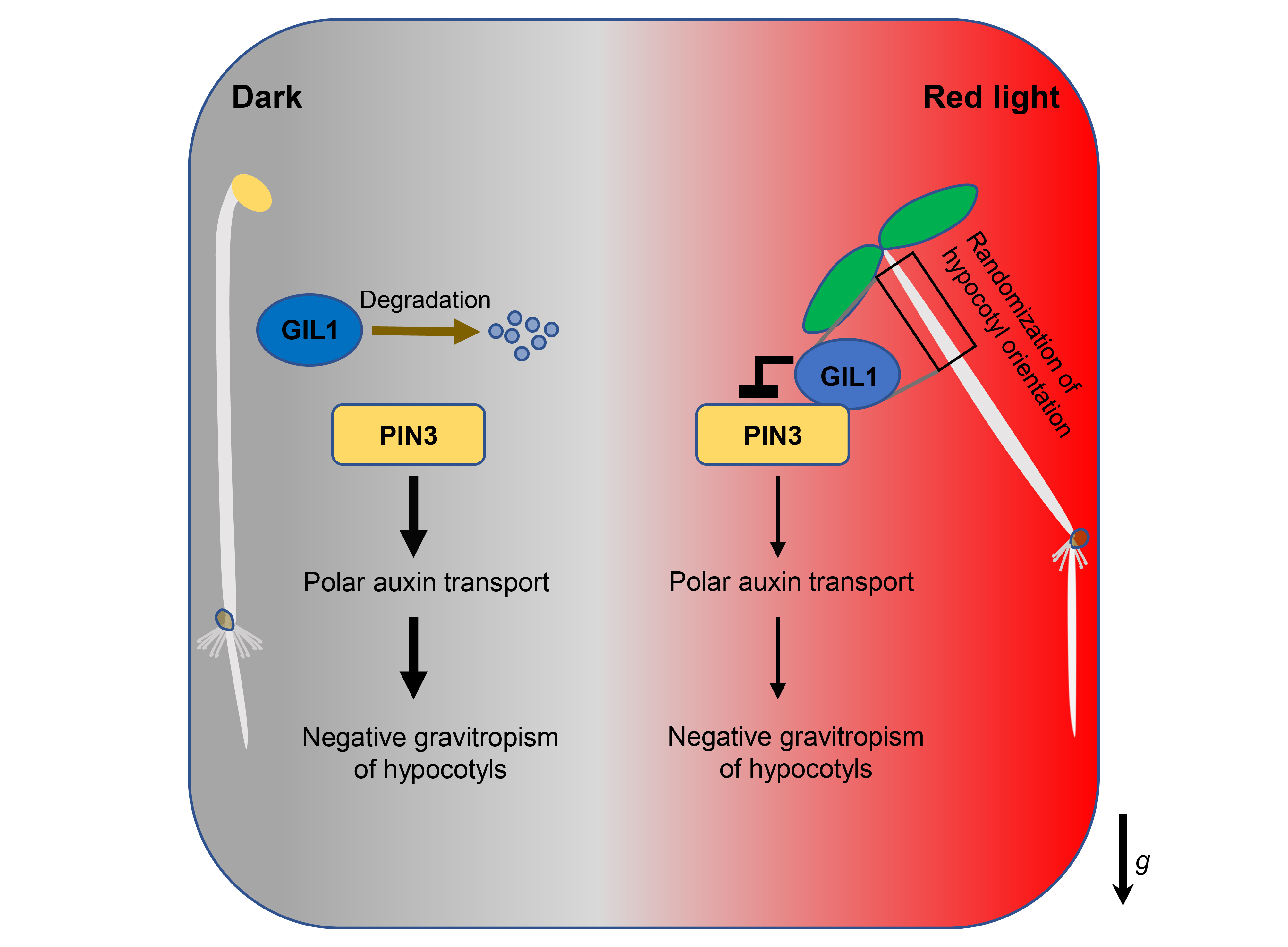 红光或远红光照射能减弱植物胚轴的负向重力性,使其偏离重力方向,这一现象被称为Randomization of hypocotyl orientation (RHO),该调控过程可提高植物在出土与能量捕获等方面的适应性。前人通过正向遗传筛选在拟南芥中获得了gil1突变体,其胚轴的负向重力性在红光或远红光下优于野生型,然而GIL1的工作机制长期未知。陈浩东团队的研究发现,gil1突变体与红光受体突变体phyB在红光下胚轴的负向重力性表型基本一致,这表明GIL1是红光抑制胚轴负向重力性的关键因子。GIL1蛋白定位在细胞膜上,主要在胚轴上半部分的内皮层中调控植物的向重力性。GIL1蛋白与生长素转运蛋白PIN3共定位在细胞膜上并且直接相互作用。生长素转运实验证明了GIL1可以抑制PIN3蛋白的生长素转运活性。遗传学分析显示,pin3突变体可以显著减弱gil1的胚轴负向重力性,这表明GIL1很可能在PIN3的上游执行功能。该研究还揭示了GIL1蛋白含量受红光与远红光调控的机制:黑暗条件下生长的植物幼苗中GIL1蛋白因不稳定而难以积累,而红光或远红光可以显著提升GIL1蛋白的稳定性。土壤覆盖实验证实了GIL1的突变会导致植物幼苗出土率的下降。