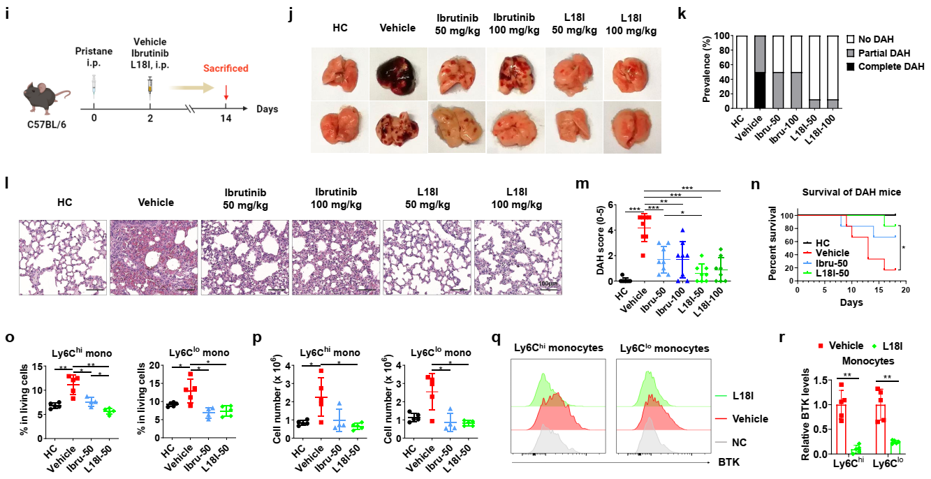 除B细胞外,BTK在髓系细胞大量表达,如单核/巨噬细胞、中性粒细胞和树突状细胞等。在DAH中,B细胞和髓系来源的单核/巨噬细胞被认为在疾病进展中发挥至关重要的作用,而BTK通过调节TLR信号、FcγR信号和NLRP3炎性小体参与髓系细胞的活化和功能,因此BTK降解剂可能在DAH中发挥多方面的作用。该论文结果显示,BTK降解剂L18I可以显著降低DAH患病率,缓解肺出血和免疫细胞浸润,减少小鼠死亡率(图2)。同时肺部细胞流式结果显示L18I给药有助于肺部正常免疫细胞微环境的维持,包括减少Ly6Chigh和Ly6Clow单核细胞的浸润。细胞内BTK含量检测表明L18I主要通过作用于单核细胞缓解DAH症状,其次是B细胞、树突状细胞、巨噬细胞和中性粒细胞。在缓解小鼠DAH表型包括肺部出血、炎症以及细胞浸润等方面,BTK降解剂L18I都要优于抑制剂Ibrutinib。此外体外实验也表明,L18I可以有效降低单核/巨噬细胞刺激活化后炎性细胞因子的表达和分泌。
