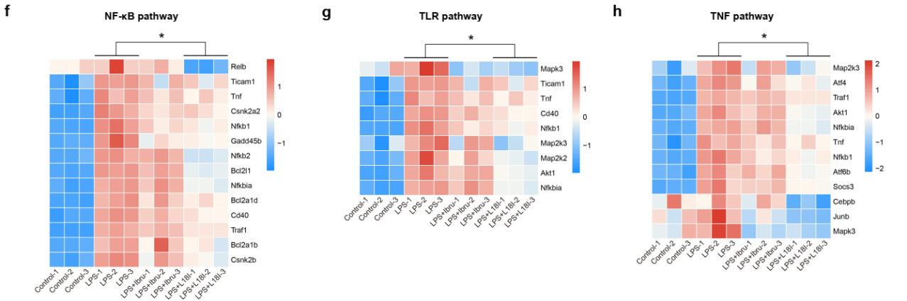 综合上述结果,L18I不仅可以通过减少抗体分泌有效缓解狼疮症状,还可以通过减轻炎症反应来缓解DAH。考虑到Ibrutinib由于脱靶效应和导致新突变的出现而产生的多重副作用,L18I有可能成为一种更安全、更有效的替代BTK抑制剂治疗自身免疫性疾病的方案。此外,该论文还强调了L18I在抑制TLR信号通路激活方面相比于Ibrutinib的优势,也展示出L18I在单核细胞主导的疾病中的优越表现,因此L18I可能在TLR信号过度活化以及髓系细胞主导的疾病中发挥更多的作用。