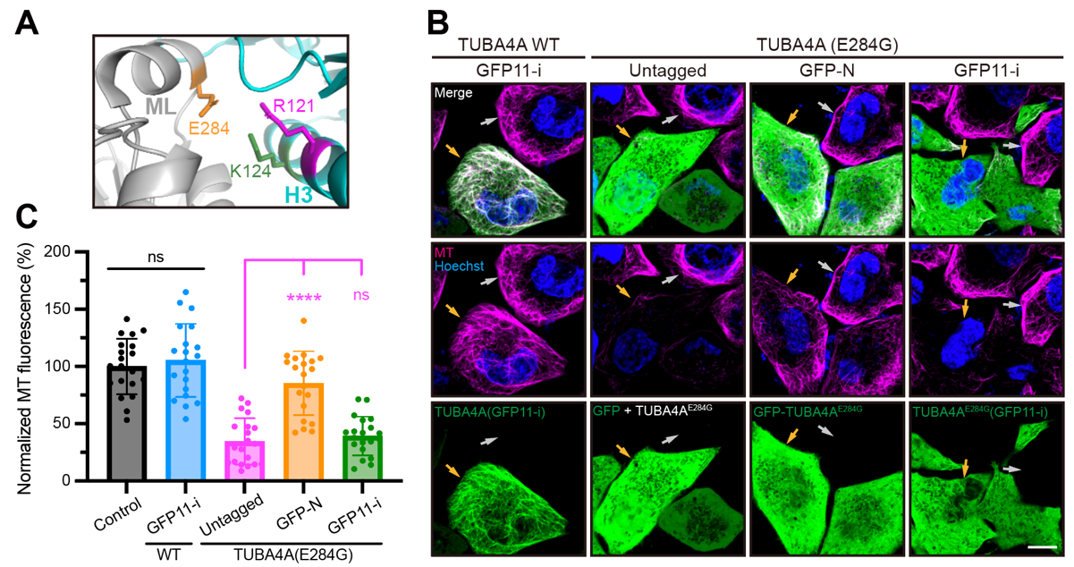 最后,为了探究GFP11-i能否高效标记带有人类疾病突变的微管蛋白突变体,作者将已知与人类不育相关的α-微管蛋白TUBA4A(E284G)突变体表达在HeLa细胞系中,发现该疾病突变体严重破坏了微管网络的形态(图3A-C)。进而,作者分别表达了传统GFP标记或GFP11-i标记的TUBA4A(E284G),发现GFP标记严重干扰其病理学表型,而GFP11-i则能够高保真地对突变体微管蛋白进行活细胞荧光标记(图3 A-C),提示其在微管蛋白相关疾病研究中的重要应用潜力与价值。