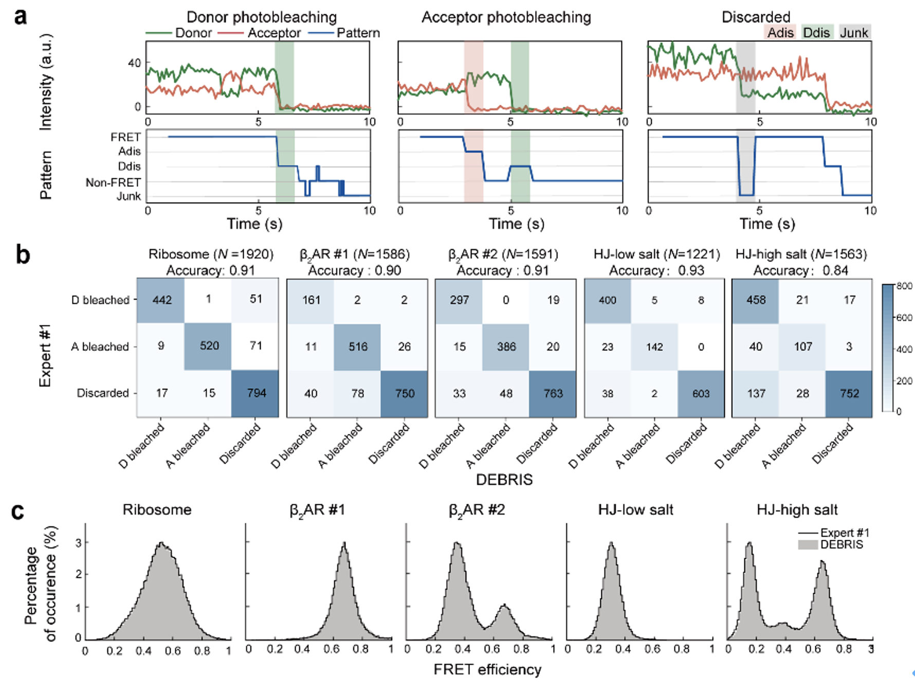 为了评估DEBRIS在双色荧光轨迹上的分类性能,研究者使用了五组单分子双色 FRET 数据集(图 2)。以人工分类结果作为基准时,DEBRIS获得的FRET分布与人工分类结果相似性达到99%。这一结果凸显了DEBRIS的准确性,同时在效率、客观性和可重复性方面具有显著优势。