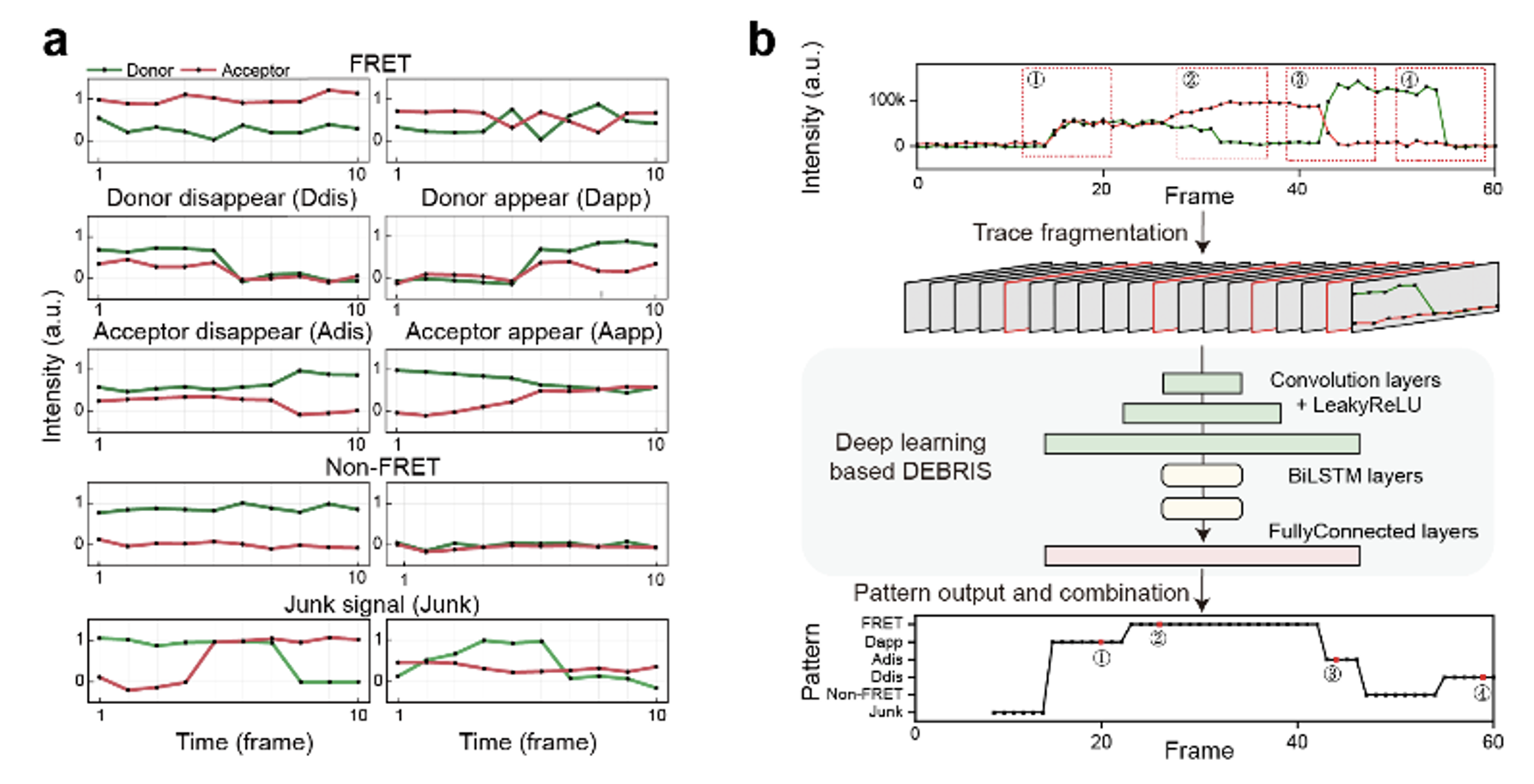 DEBRIS的核心理念在于,所有长时间尺度的单分子轨迹都是由有限类型的包含特定局部特征的短片段构建而成的。类似于俄罗斯方块中,有限的积木类型可以拼接出多种多样的复杂结构。DEBRIS模型中包含七个类别的双通道短片段强度-时间迹线,以模拟单分子双色荧光实验中常见的局部特征(图 1a)。在应用时,DEBRIS采取滑动窗口逐帧预测局部特征,这一过程将强度-时间轨迹转换为模式-时间轨迹(图 1b)。随后,根据用户定义的标准将其进一步分类为不同组别,并识别单分子事件。结合预测短片段的局部特征、滑动窗口技术和用户定义的标准,DEBRIS能够适应任意模式和任意长度的双通道荧光轨迹,为单分子荧光事件的自动识别提供了一种强大的工具。