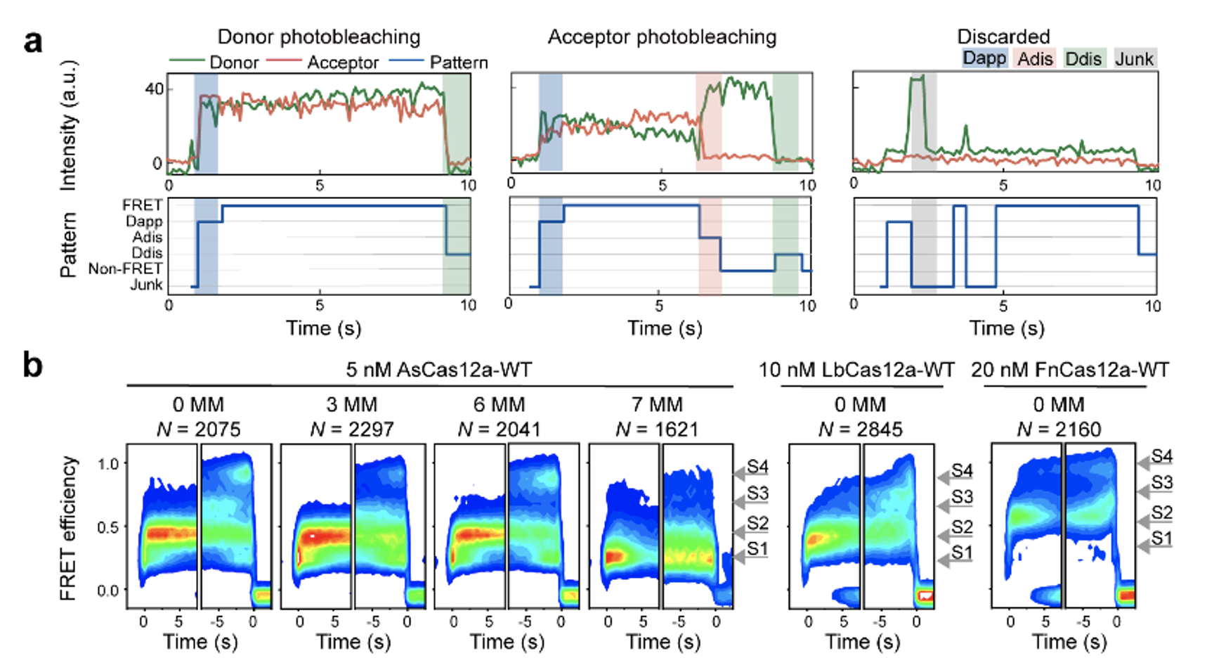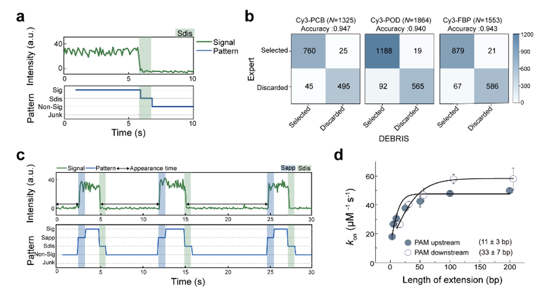 此外,研究者利用DEBRIS首次实现对动态出现的荧光信号的准确识别。动态单分子荧光信号是指在采集开始时并不存在荧光信号,但由于扩散的标记分子与表面固定的分子相互作用导致荧光信号在采集过程中出现(图3)。例如,在研究Cas12a对DNA的切割过程中,可以动态捕捉到Cas12a结合、切割和DNA片段解离等一系列动态过程(图3a)。但已发表的深度学习模型尚无法有效处理此类动态单分子荧光信号。研究者展示了DEBRIS可自动识别出 Cas12a 的结合和切割事件,并基于分类结果生成了FRET 概率随时间变化密度图,可表征切割过程中Cas12a的一系列复杂构象变化。