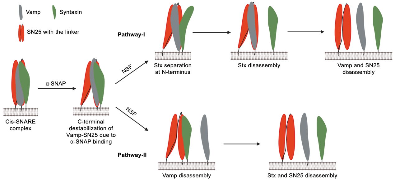 图2. NSF解聚SNARE复合体的两条主要路径示意图