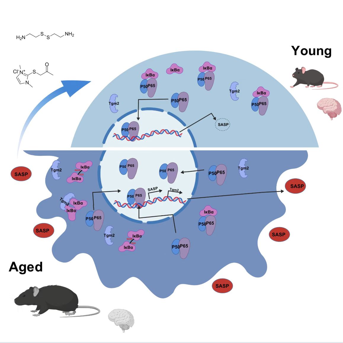 课题组成员李志强博士发现Tgm2蛋白在衰老小鼠的小胶质细胞中高表达,其表达水平在衰老细胞模型也显著上调。 进一步的研究揭示Tgm2在小胶质细胞中催化IκBα的K22和Q248残基发生共价交联,降低了游离IκBα的水平,从而驱动了NF-κB向核内转移,促进了衰老相关分泌表型(SASP)。而SASP又上调Tgm2的表达,形成了一个正反馈循环通路Tgm2-NF-κB-SASP,加速了小胶质细胞的衰老。此外,Tgm2抑制剂(Tg2-IN1和半胱胺)能够减少衰老小胶质细胞NF-κB的核转移,降低SASP。更重要的是,半胱胺的口服给药显著改善了老年小鼠的衰老表型,提示Tgm2有望成为延缓衰老的靶标,并且半胱胺有可能是一种新型的衰老相关表型抑制剂。
