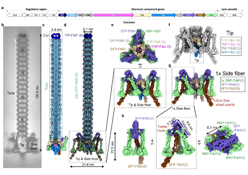 Monocin全长约103纳米,由22个六聚体环状主要尾部蛋白(TTP-FtbG)螺旋状堆叠形成柔性管状核心,相邻环的FtbG由二硫键连接。尾管近侧由终止蛋白(TrP-FtbF)六聚体封闭形成帽区,远侧则由基板枢纽蛋白(BHP-FtbL)三聚体封闭并形成尾刺,并通过远侧尖端蛋白(DTP-FtbK)三聚体连接的“钓竿-三钩”复合体(FtbN三聚体)与侧纤维结合。