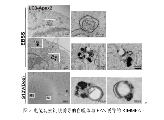 在该项研究中,研究者以RAS突变的癌症模型探索自噬在肿瘤中的详细分子机制。研究者发现了一种由RAS突变表达诱导的非经典自噬,命名为RINCAA (RAS-Induced non-canonical autophagy via ATG8ylation)。与饥饿诱导的自噬相比较,RINCAA受不同的自噬因子调控,形成ATG8家族蛋白(如LC3和GABARAP)标记的多膜泡和多层结构的非经典自噬体结构,将其命名为RIMMBA (RAS-induced multivesicular/multilaminar bodies of ATG8ylation) (图2) 。