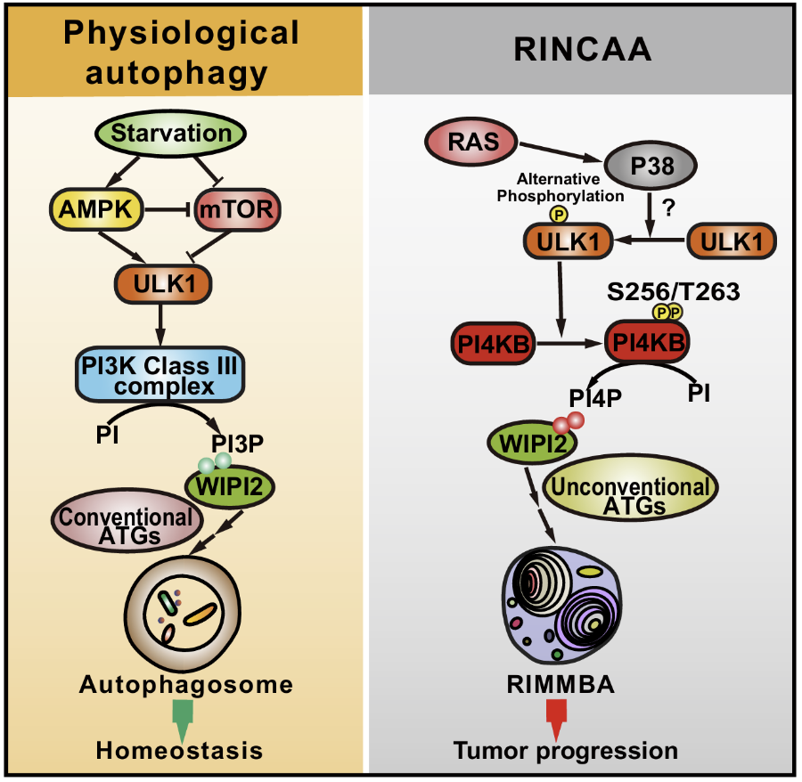 RINCAA的一个显著特征是经典自噬通路中的PI3K被替换为PI4KB。研究者鉴定了P38-ULK1-PI4KB-WIPI2级联信号控制这一过程,KRAS激活下游P38通路,进一步促进ULK1的激活。激活的ULK1促进PI4KB在S256和T263位点磷酸化并促进PI4P的产生,WIPI2作为PI4P效应器招募ATG16L1/ATG12-ATG5酯化复合体促进ATG8ylation和非经典自噬体的形成。