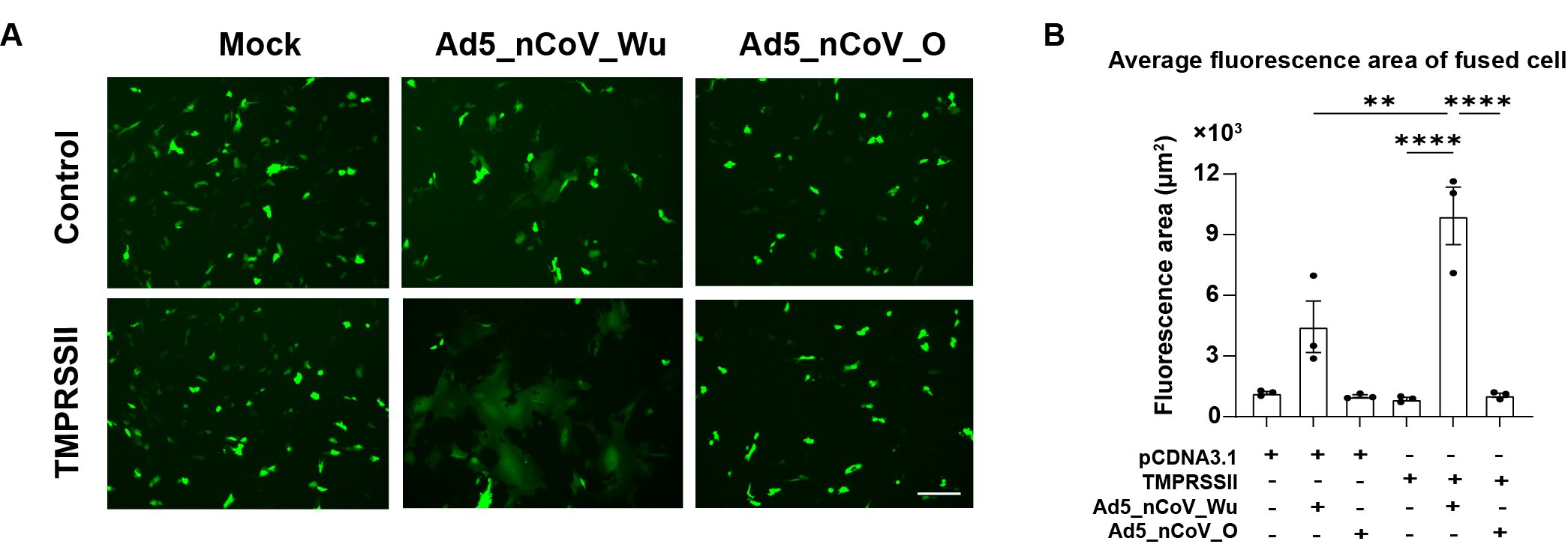 团队在细胞水平的研究中发现,Ad5-nCoV_Wu疫苗诱导的S蛋白在细胞膜上能够介导细胞间融合,形成合胞体,而Ad5-nCoV_O疫苗由于2P突变和S1/S2切割位点的删除,显著减少了合胞体的形成,表明这些突变有效稳定了S蛋白的前融合构象,防止了细胞间融合的发生(图2)。