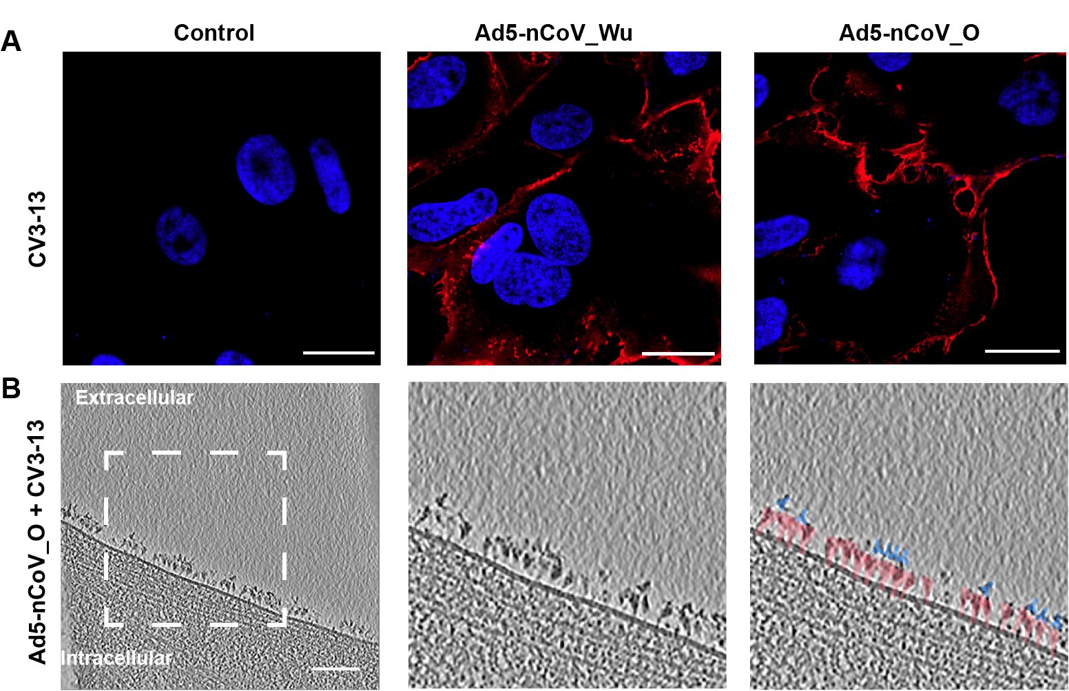 为了在原位水平上验证Ad5-nCoV疫苗诱导的S蛋白的免疫原性,团队使用特异性识别S蛋白的抗体对接种Ad5-nCoV_O疫苗的细胞进行孵育并进行免疫荧光观察及cryo-ET数据收集。在原位上发现Ad5-nCoV疫苗诱导的S蛋白可以被抗体识别并结合,具有良好的免疫原性(图4)。
