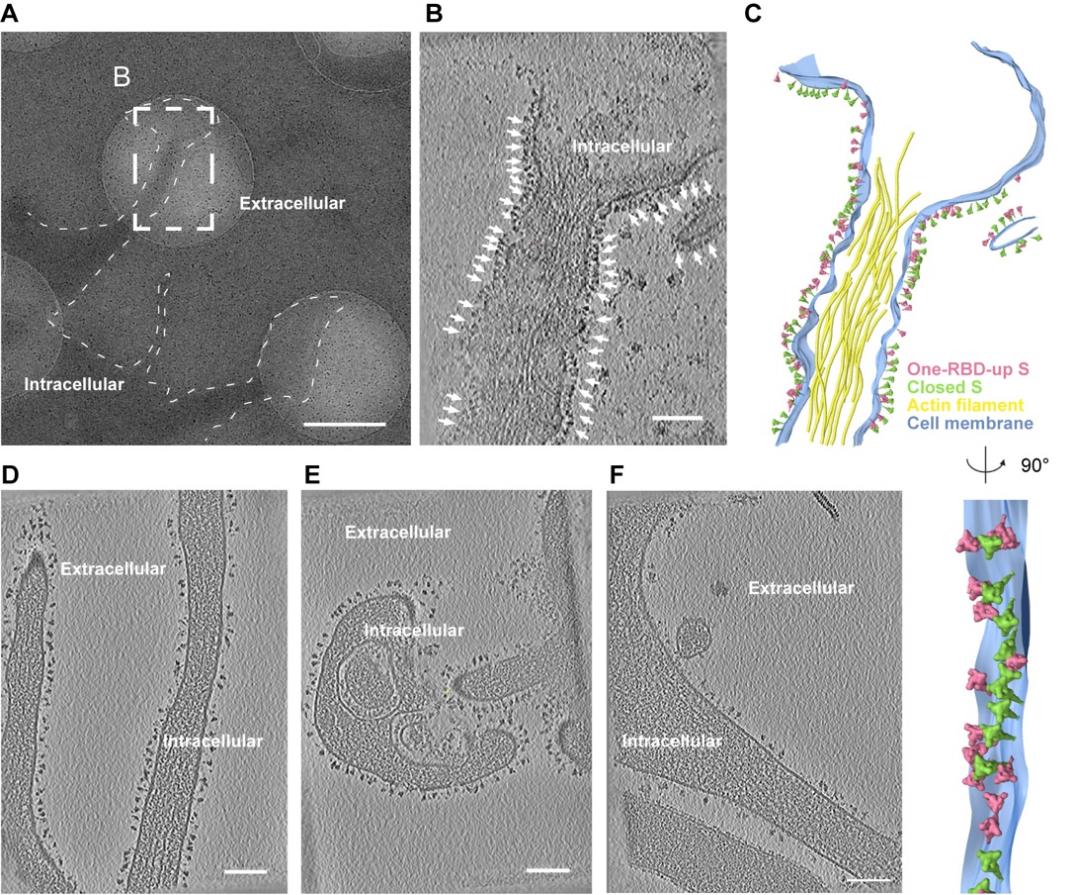 通过子断层平均(sub-tomogram averaging)方法,团队解析了S蛋白的原位结构。发现其结构与天然SARS-CoV-2病毒上的S蛋白高度相似,S蛋白结构完整且RBD结构域具有灵活抬起和落下的特性(图3)。