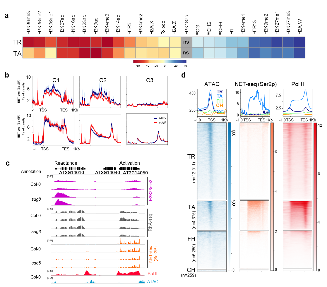 为了探究sdg8突变体中H3K36me3水平升高基因(C3基因)的转录状态,研究人员进行了新生转录本测序(NET-seq)。结果表明,无论在野生型还是sdg8突变体中,C3基因位点处几乎检测不到转录活性(图2b-d),这一结果与现有的H3K36me3增强转录延伸观点相悖。我们已知转录激活(Transcription Active,TA)区域为具有Pol II结合以及开放染色质状态(高信号的ATAC-seq)且转录水平较高的区域(图2a-d,图3)。与之相对应,研究人员将有Pol Ⅱ结合(Pol II ChIP-seq)和开放染色质状态(ATAC-seq)但Pol II转录信号极低(Pol Ⅱ Ser2P NET-seq水平)的区域定义为“转录阻抗”(Transcription Resistive,TR)基因(图2a-d,图3)。
