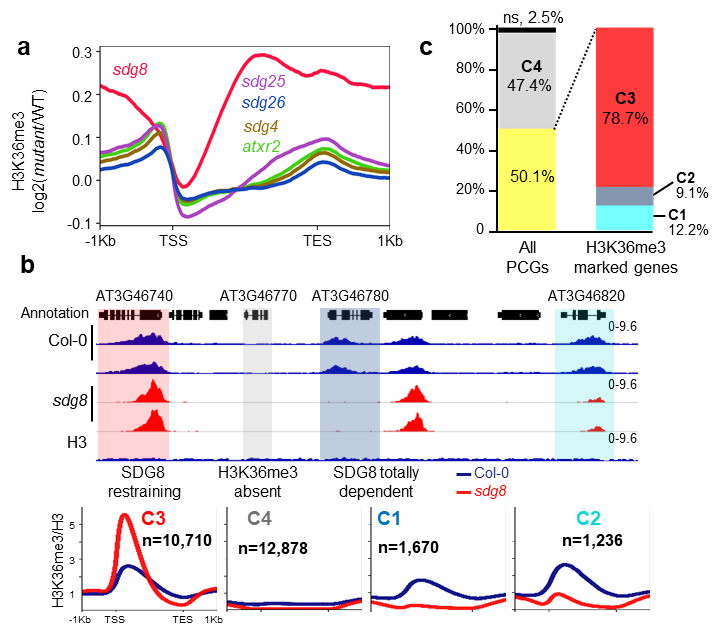该研究起始于分析拟南芥中不同H3K36甲基转移酶催化H3K36甲基化的差异。研究人员对不同的甲基转移酶突变体进行了H3K36me3的ChIP-seq分析,并意外发现与野生型Col-0相比,突变体sdg8中编码基因上的H3K36me3水平显著增加(图1a)。随后根据突变体sdg8中H3K36me3水平的变化模式,研究人员对编码基因进行了分类(分为C1-C4共四类,图1b和c),其中SDG8基因突变会导致C3类别的基因位点(约占总基因数的40%)表现出显著升高的H3K36me3水平,表明甲基转移酶SDG8存在抑制H3K36me3积累的功能(图1b)。