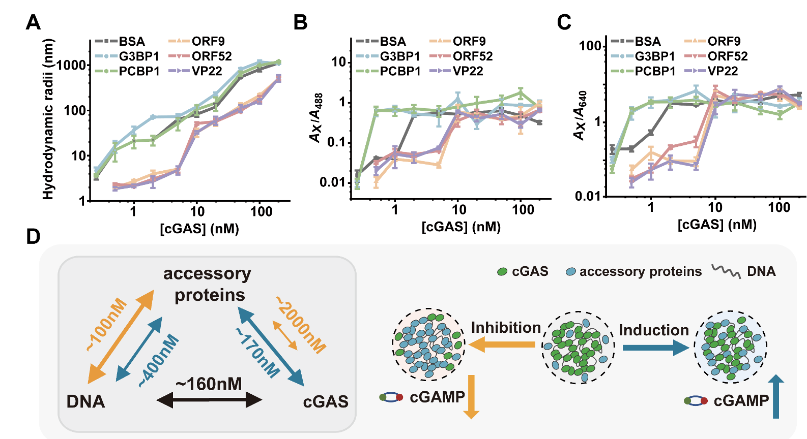 蛋白G3BP1和PCBP1能够促进cGAS的相分离并增强其活性,而病毒外壳蛋白来源的蛋白ORF9、ORF52及VP22则具有抑制作用。dcFCCS的定量表征揭示了,发挥抑制作用的辅助蛋白显著降低了凝集物的水合半径,提高了相分离临界浓度;而发挥促进作用的辅助蛋白增大了凝集物的水合半径,降低了相分离临界浓度。进一步实验表明,两类蛋白与cGAS亲和力存在显著差异。促进蛋白与cGAS和dsDNA均可以发生较稳定的相互作用,从而促进三元相分离的发生,提高低浓度下cGAS的活性;抑制蛋白与dsDNA结合较强,而与cGAS结合较弱,因而得以阻碍cGAS与dsDNA的结合、相分离从而抑制cGAS的激活。