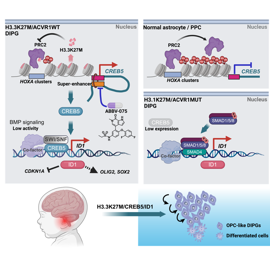 这项工作是继两个研究团队此前在 Nature Cancer上报道BMP信号通路在不同亚型的DIPG中呈现不同活性后(H3.1K27M亚型BMP信号增强,H3.3K27M亚型BMP信号抑制),进一步深入解析了BMP下游关键靶基因ID1的激活机制。研究表明,尽管在H3.3K27M亚型中BMP信号被抑制,ID1依然高度表达,其表达并非由BMP信号直接驱动,而是由CREB5转录因子通过超级增强子直接激活。这一发现打破了传统“通路—靶基因”线性调控的理解,揭示了癌组蛋白通过CREB5-ID1轴重塑DIPG干性表型的新机制。