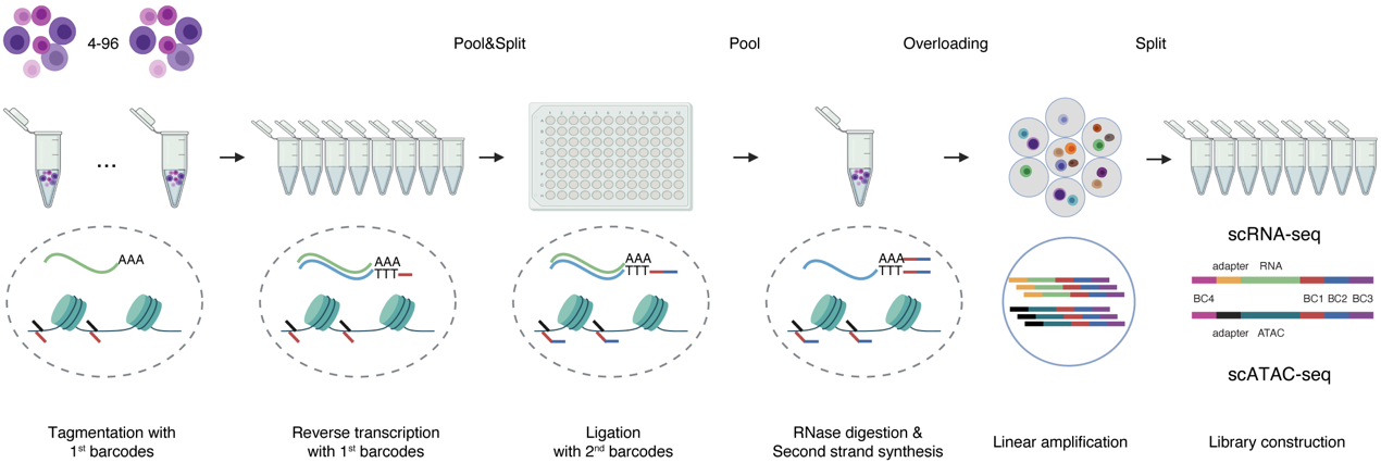 图注:Parallel-seq 结合组合索引与微液滴过载技术,同时测量同一个单细胞中染色质可及性和基因表达