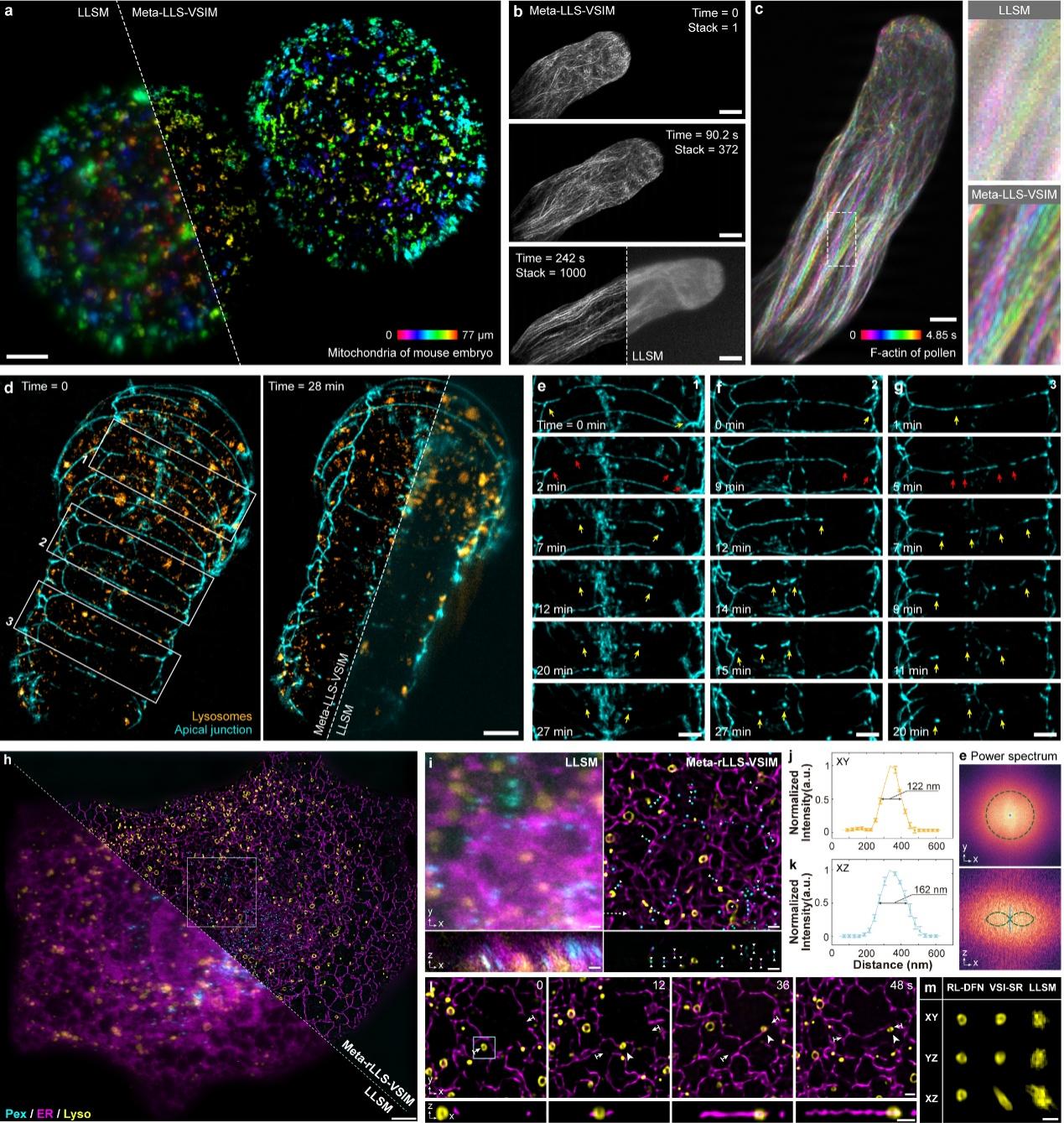 为展示Meta-rLLS-VSIM的快速五维(波长通道-XYZ三维空间-时间)超分辨活细胞成像能力,合作团队对小鼠胚胎(图a)、植物花粉管(图b、c)、线虫胚胎(图d-g)等大体积厚样本进行了长时程超分辨观测。兼具晶格光片照明的物理光学层析与近各向同性的三维超分辨能力,Meta-rLLS-VSIM清晰地揭示了花粉管顶端极性生长、秀丽隐杆线虫胚胎发育过程中质膜融合等生物过程。