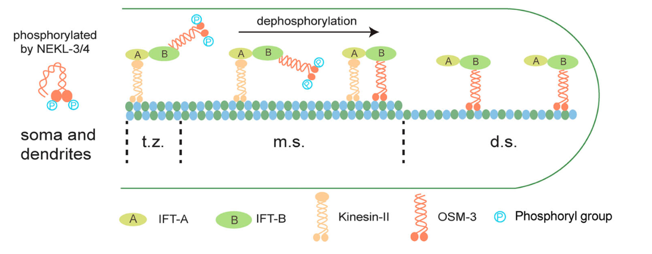 图1. 磷酸化调控纤毛驱动蛋白OSM-3区域活性机制示意图(t.z.:纤毛过渡区;m.s.:纤毛中间段;d.s.:纤毛远端段)。