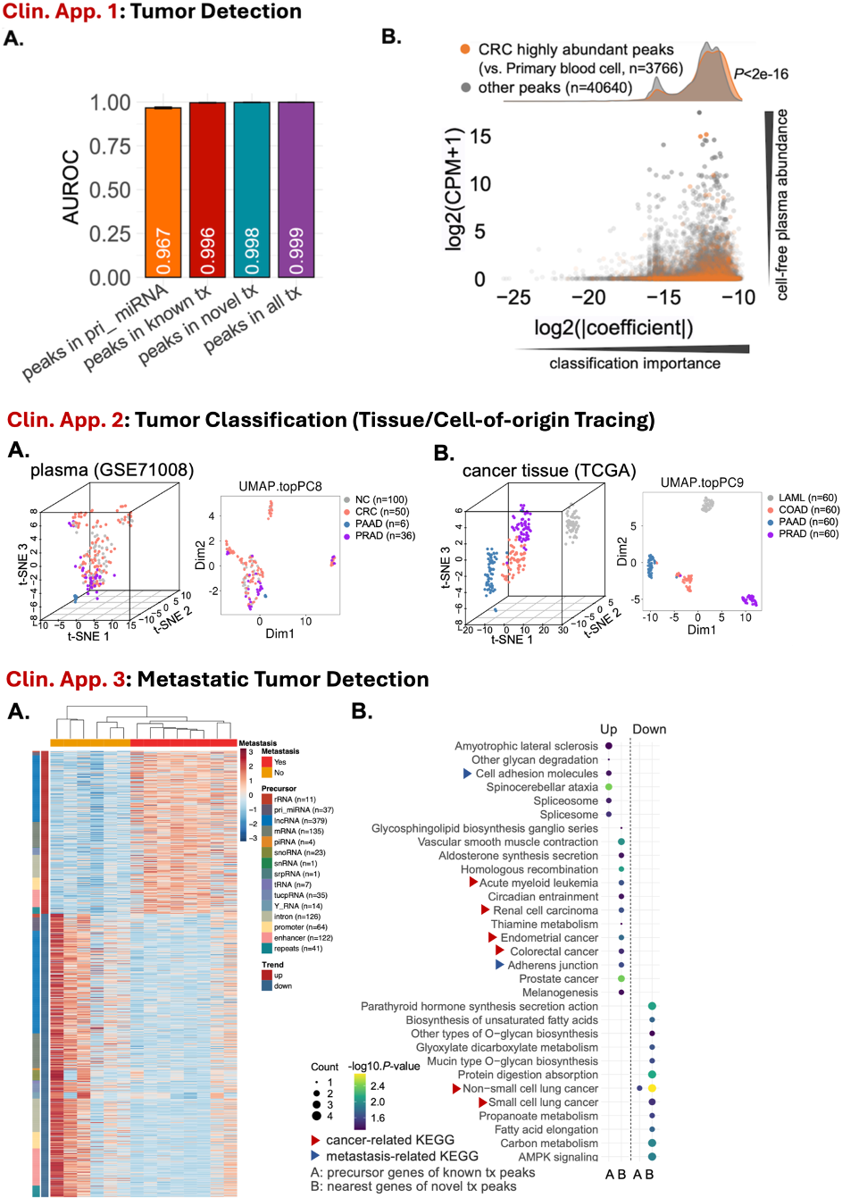 在被应用到肿瘤液体活检时,cfPeak在体液数据中有效识别了与结直肠癌相关的cfRNA信号峰(图4AB),并提供了有关实体瘤位点(图4CD)和口腔癌转移(图4EF)的信息。临床应用中的结果揭示了癌组织起源的低丰度cfRNA的重要性,表明cfPeak具有在血浆样本中识别出具有癌症检测、癌种区分及转移状态指示能力的片段化cfRNA峰区信号的潜力。