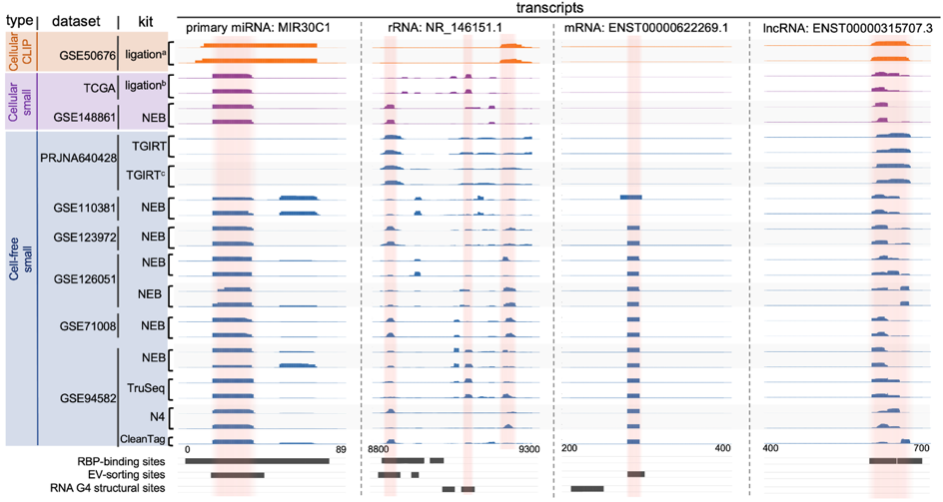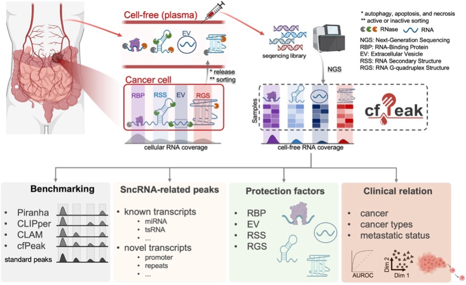 液体活检是近年来发展起来的新型无创诊断技术,可以实时动态地监测人体的健康和疾病状态。细胞游离RNA(cell-free RNA,cfRNA)由于具有高度的敏感性、动态性和组织朔源能力,为肿瘤、自身免疫疾病、孕期疾病、神经退行性疾病等复杂性疾病的无创检测带来了新的希望。细胞游离RNA广泛存在于血液等多种人类体液中,通常被包裹在细胞外囊泡(EV)中或与蛋白结合形成核糖核酸蛋白复合体(RNP)。然而cfRNA本身高度碎片化、异质性高且信噪比低(病灶来源的cfRNA占比低),给其灵敏识别和临床应用带来了诸多挑战。另一方面,被核小体或转录因子保护的碎片化cfDNA的片段组学近年来已有很多研究的积累,被证明在肿瘤诊断和预后等多个场景均有一定应用潜力,而具有广阔临床应用前景的cfRNA中的片段化特征则由于生物信息学分析方法的缺乏鲜有研究。