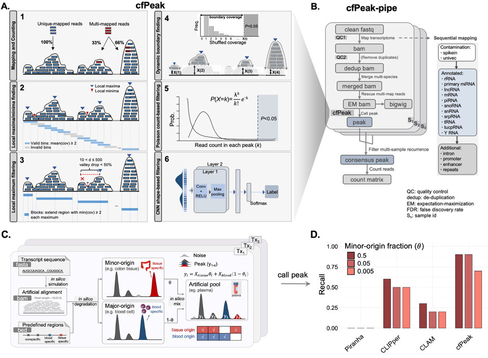 考虑到本研究之前提到的不同工具的差异,在使用传统的峰区识别工具探索片段化cfRNA时,可能会面临建模不恰当或参数不适合的风险。为此,作者引入了信号峰区识别方法cfPeak来填补这一空白。cfPeak借鉴了其他方法的多项优点,整体可分解为六个主要模块(图3A),并搭建了片段化cfRNA峰区分析的整个流程(图3B)。