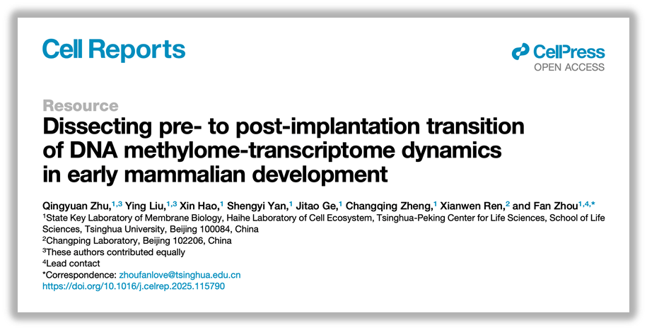 2025年6月3日,清华大学生命科学学院、清华-北大生命联合中心周帆课题组在《细胞报告》(Cell Reports)杂志在线发表了题为“解析早期哺乳动物发育中DNA甲基化-转录的着床前后转变”(Dissecting pre- to post-implantation transition of DNA methylome-transcriptome dynamics in early mammalian development)的研究论文。该研究结合高精度多组学挖掘与体内外模型验证等体系,从围着床胚胎主要谱系及其亚群特异性DNA加甲基化模式、基因组元件上父母源DNAme差异、启动子DNAme与RNAex协同变化等多个角度,系统解析了围着床胚胎DNAme和RNAex协同动态调控模式。