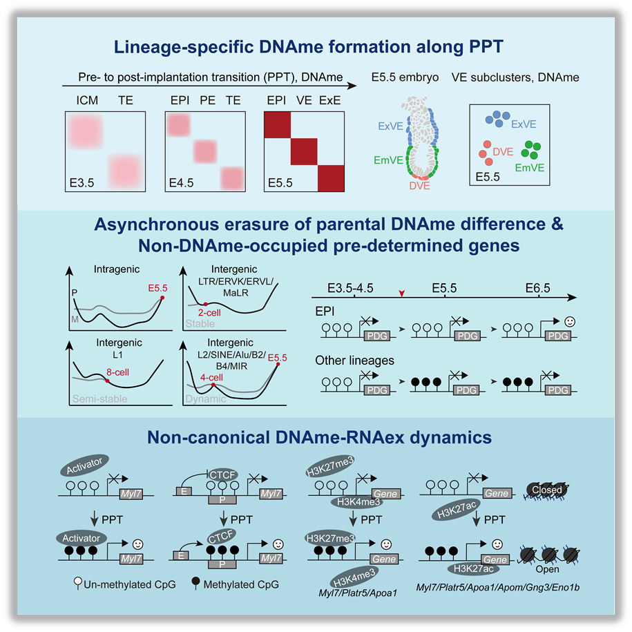 哺乳动物胚胎的着床前后转变(Pre- to post-implantation transition, PPT)是早期胚胎发育过程中的关键生物学事件。在这个发育窗口期,胚胎经历剧烈的发育重编程,在细胞和分子水平发生一系列精密调控事件,例如多能性状态的转变、第二次细胞命运决定、前后对称性打破、大规模的表观遗传重编程等。近年来,少量细胞或单细胞组学测序和分析技术的进展,极大推动了早期发育分子动态图景的绘制与理解,多个研究组曾报道哺乳动物胚胎在早期发育过程中DNA甲基化(DNA methylation,DNAme)的动态特征。作者团队曾报道人类着床后胚胎发育经历了谱系特异性DNA加甲基化1,然而该过程是否在物种间保守,以及哺乳动物胚胎PPT过程中DNAme和与基因表达(RNA expression,RNAex)如何协同调控、是否影响谱系命运转变,其机制有待进一步揭示。