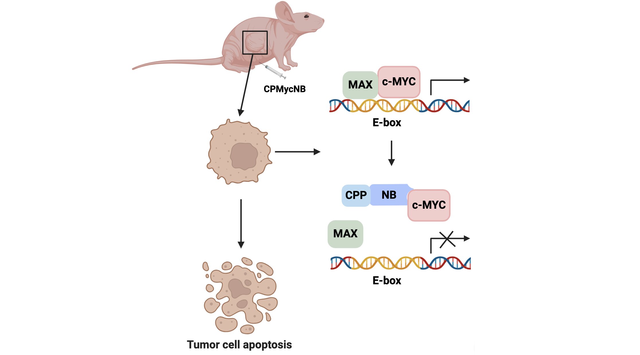 图:靶向c-MYC的纳米抗体复合物(CPMycNB)抑制致癌基因调控的下游基因转录并诱导肿瘤细胞凋亡