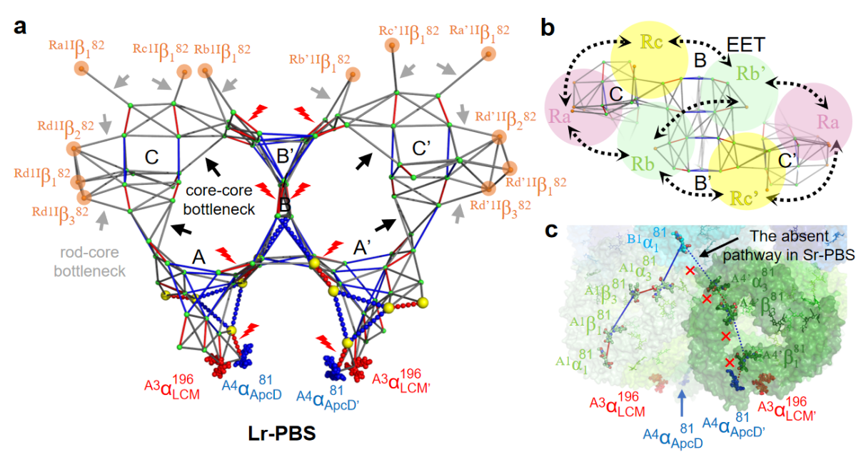 此外,研究人员在考虑色素之间的距离和色素取向的基础上,对束状PBS的藻胆色素整体排列和能量传递效率进行了分析,结果表明束状PBS能够实现杆与杆之间的能量传递,进而弥补因远核端杆的能量传递距离延长而导致的效率下降;同时低光强下Lr-PBS核中色素共面性的提高,增强了Lr-PBS核的能量传递效率,从而保障G. violaceus在弱光下的生长及环境适应(图3)。综上,该研究成果揭示了无类囊体膜蓝藻中束状PBS的组装,以及其在应对光照变化时的适应性机制。该工作为藻胆体的进化过程以及蓝藻的光保护机制提供了重要信息,也为人工模拟光合作用研究提供了新的理论依据。