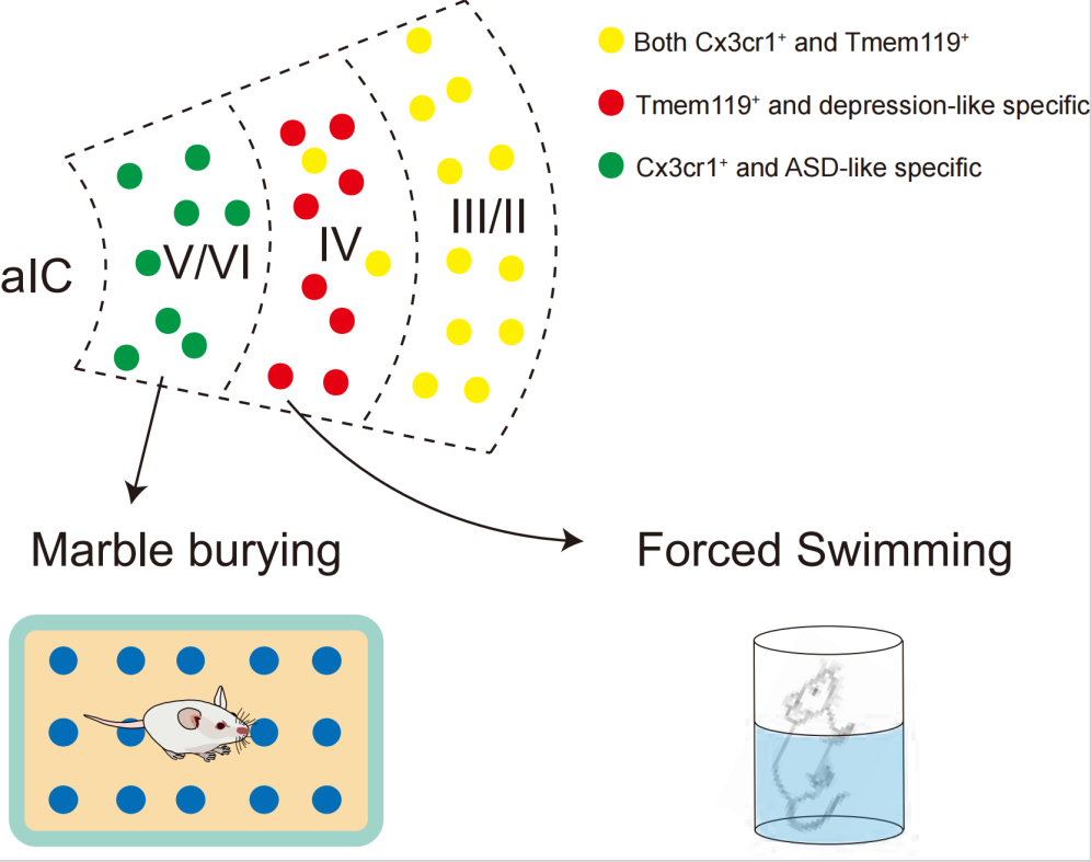 姚骏实验室通过PLX5622灭活小鼠aIC区域的小胶质细胞后发现,aIC小胶质细胞的全部丢失会诱发小鼠的抑郁样和自闭样表型。接着,研究团队研究了自闭症模型小鼠和抑郁症模型小鼠,发现小鼠aIC脑区的Cx3cr1阳性小胶质细胞和Tmem119阳性小胶质细胞的形态异常与两种疾病分别相关。进一步,作者通过使用条件性AAV和特异性Cre工具鼠,分别抑制小鼠aIC的Cx3cr1阳性小胶质细胞和Tmem119阳性小胶质细胞,发现Cx3cr1阳性细胞被抑制后,小鼠表现出自闭样行为,并不表现出抑郁样行为;而Tmem119阳性细胞被抑制后,小鼠仅表现出抑郁样症状。这些结果表明aIC存在不同亚型的小胶质细胞,它们分别调控不同的行为。