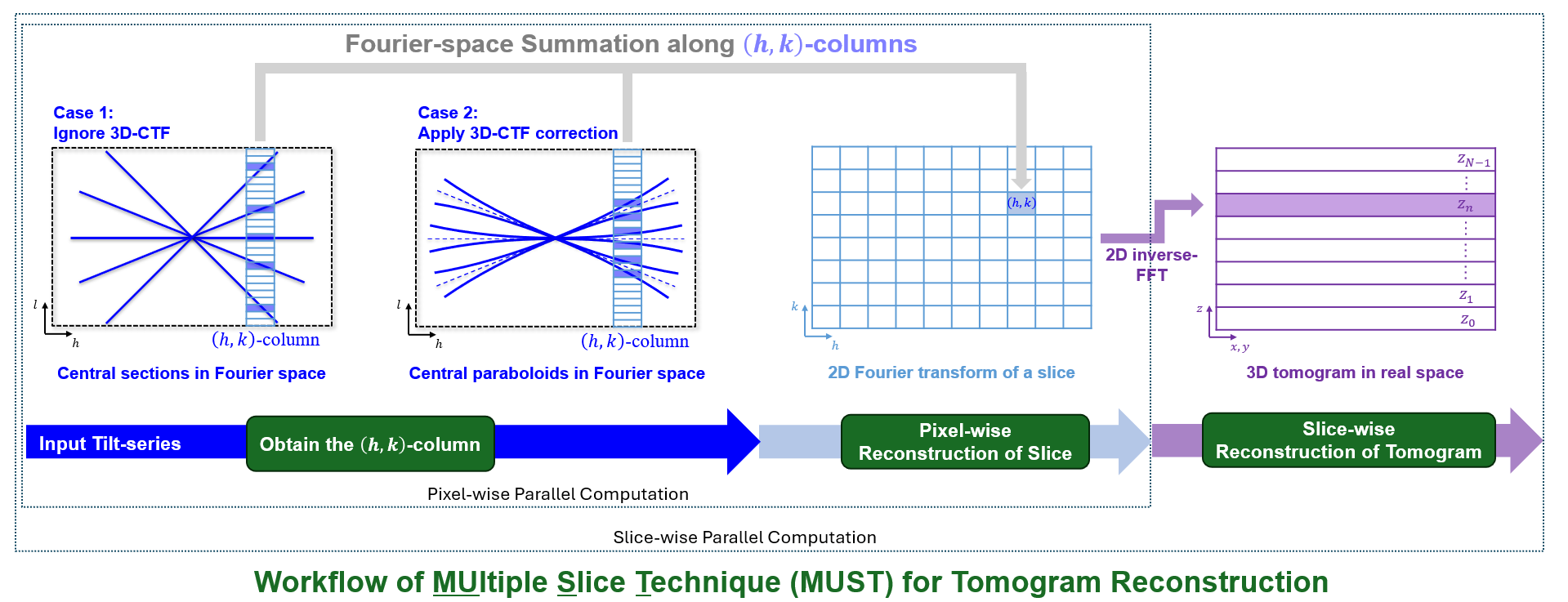 2025年8月10日,清华大学生命科学学院李雪明副教授课题组和清华大学电子工程系沈渊教授课题组联合在“Ultramicroscopy”杂志在线发表研究论文,题目为“基于傅里叶空间的冷冻电子断层成像多层重建方法”(Fourier-based multiple-slice reconstruction in cryo-electron tomography)。论文报道了一种基于傅里叶空间的冷冻电子断层成像三维断层重建方法MUST(MUltiple Slice Technique,图1)。该方法将三维重构密度图看作是由一系列平行平面层(parallel slice,PS)组成的,通过逐层独立计算的方法来合成最后的三维图像。而对于一个平行平面层的计算是通过在傅里叶空间按像素列投影计算得到的。由于像素列的计算是互相独立的,可以实现像素级的并行计算。由此形成实空间平面级并行与傅里叶空间像素级并行的两级并行架构,可大幅提升重建效率。通过对傅里叶空间中频点的相应加权操作,MUST可以获得与基于实空间的WBP和SIRT方法衬度相似的重构结果(图2)。研究团队同时发现,在考虑样品离焦量梯度(defocus gradient)的三维衬度传递函数校正(three-dimensional contrast transfer function correction,3D-CTF correction)中,傅里叶空间中的平面状的中心截面会劈裂为一对中心共轭抛物面(pairs of conjugate central paraboloids,PCCP)。