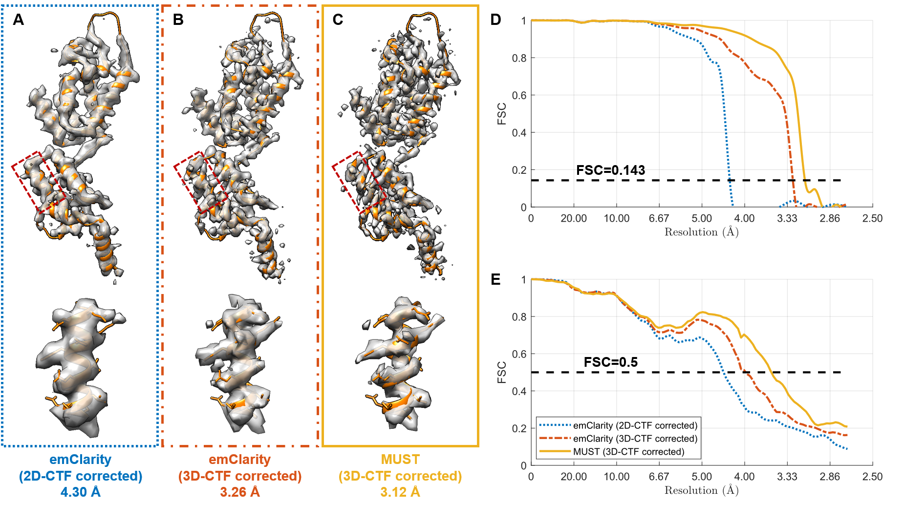 测试表明,MUST可以实现无混叠重建,消除了由于实空间重建方法的插值误差所引入的反折条纹,以及由于实空间三维衬度传递函数校正对于离焦量梯度的离散化所引入的条纹(图3)。进一步的子断层平均实验表明,MUST通过消除傅里叶空间中的混叠,相比实空间重建方法可以获得更高分辨率的蛋白质重构结果(图4)。