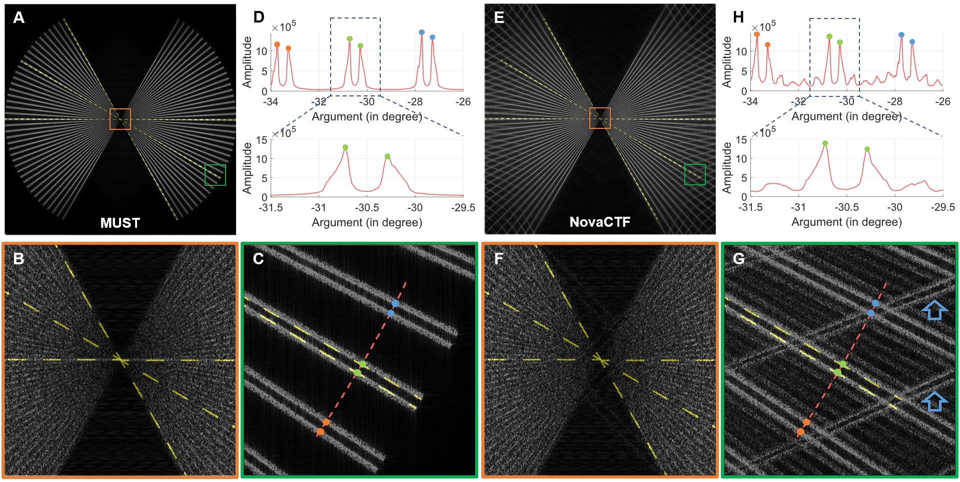 图3:重构密度图截面功率谱对比。(A-D)MUST;(E-H)NovaCTF