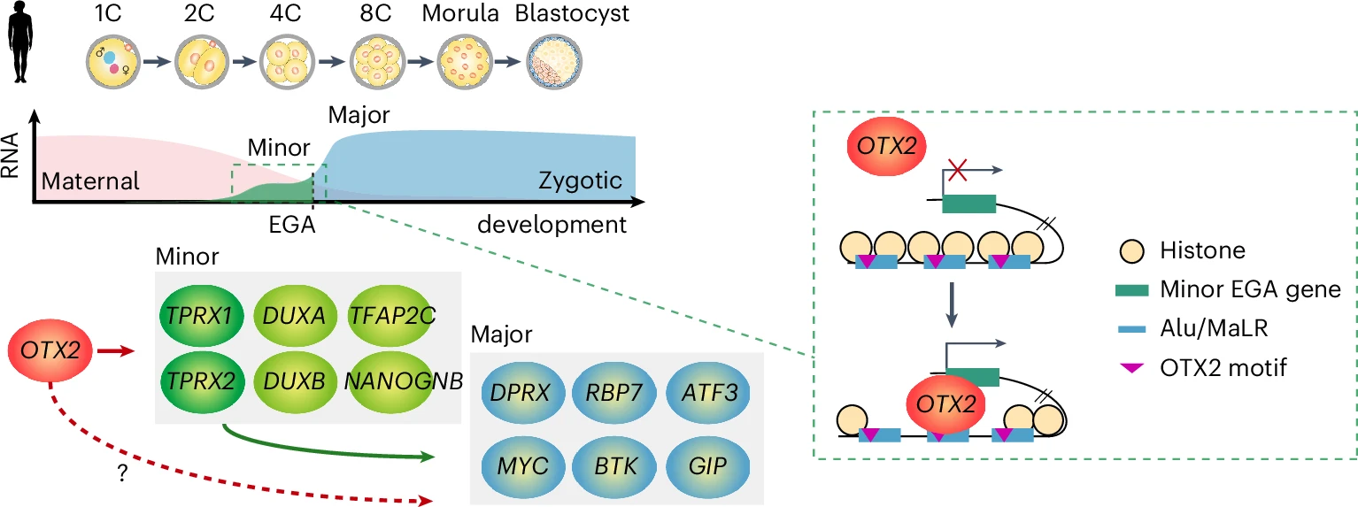 2025年10月27日,清华大学生命学院颉伟教授课题组、山东大学妇儿与生殖健康研究院陈子江院士和赵涵教授课题组在《自然-遗传学》(Nature Genetics)杂志上发表了题为 “母源因子OTX2调控人类胚胎基因组激活和早期发育”(Maternal factor OTX2 regulates human embryonic genome activation and early development)的研究论文。该研究揭示了母源转录因子 OTX2 在启动人类EGA中发挥关键作用,并探究其在早期人类生命起始阶段重要的分子调控机制,对发育生物学和生殖医学领域具有重要意义。